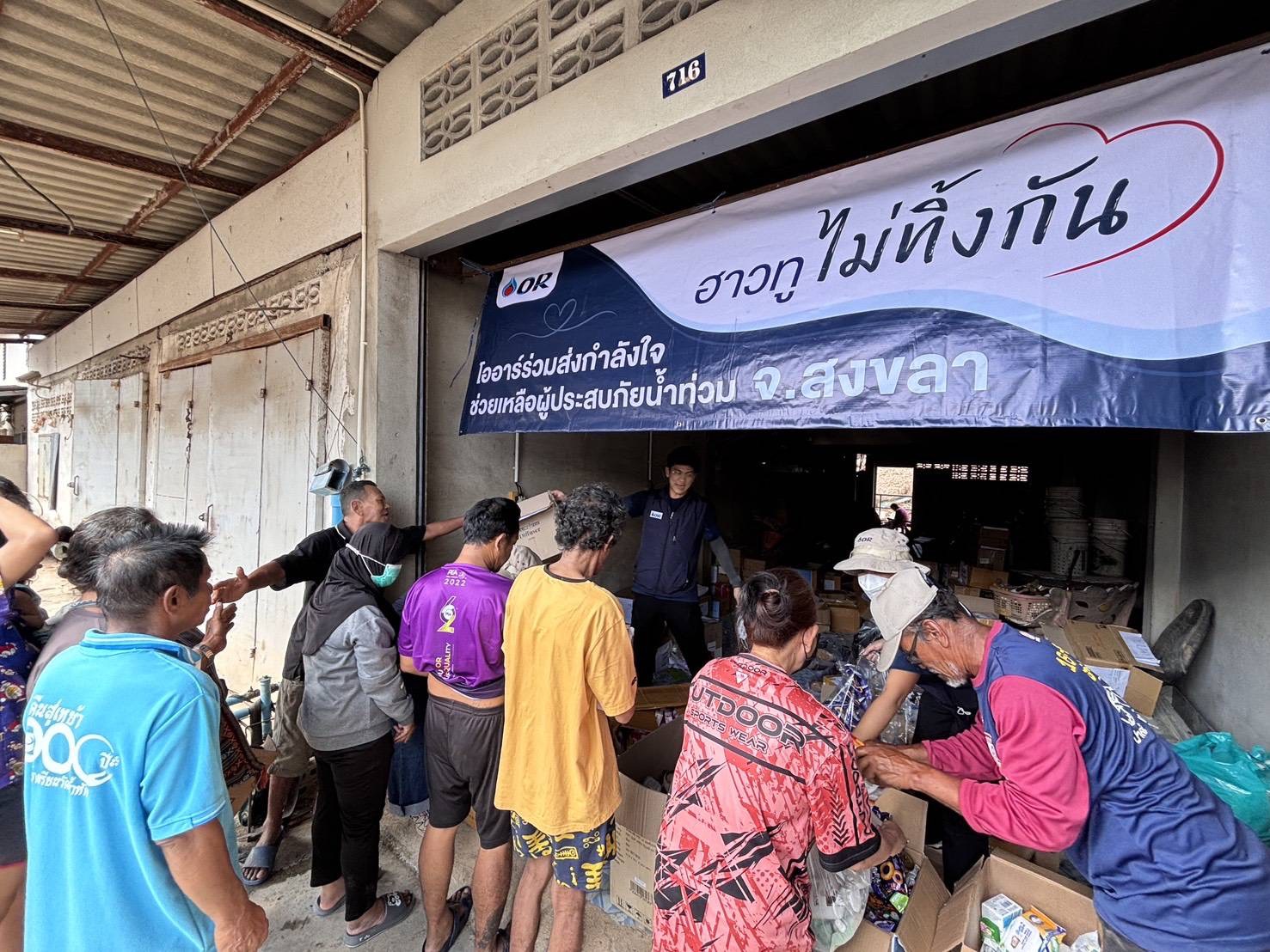 หม่อมหลวงปีกทอง ทองใหญ่ ประธานเจ้าหน้าที่บริหาร บริษัท ปตท. น้ำมันและการค้าปลีก จำกัด (มหาชน) หรือ โออาร์ พร้อมด้วยผู้บริหารและพนักงาน ร่วมส่งมอบของบริจาค เครื่องอุปโภค สิ่งของที่จำเป็น อาทิ เสื้อผ้า รองเท้า เครื่องนอน อาหาร ซึ่งรับบริจาคผ่านโครงการ “ฮาวทูไม่ทิ้งกัน” เพื่อส่งต่อไปยังศูนย์อพยพและศูนย์พักพิงในจังหวัดสงขลาสนับสนุนการดำเนินงานของเจ้าหน้าที่ ตลอดจนมอบให้แก่ผู้ประสบอุทกภัยได้ใช้ประโยชน์