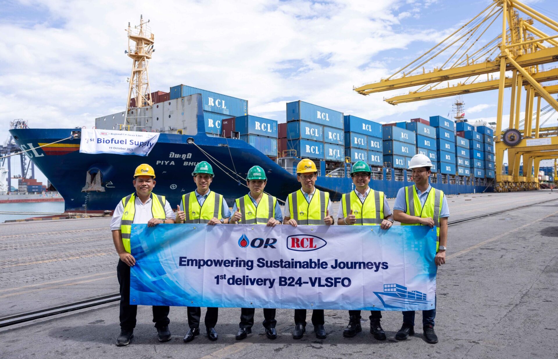 นายชัยพฤฒิ วัชรีคุปต์ ผู้จัดการฝ่ายตลาดอากาศยานและเรือขนส่ง บริษัท ปตท. น้ำมันและการค้าปลีก จำกัด (มหาชน) (OR) พร้อมด้วย กัปตันสมชาย เอี่ยมพิมลรัตน์ ผู้อำนวยการฝ่ายจัดการกองเรือ บริษัท อาร์ซีแอล จำกัด (มหาชน) (RCL) ร่วมเป็นเกียรติในพิธีจ่ายน้ำมัน B24 VLSFO (Very Low Sulphur Fuel Oil) ให้แก่เรือ PIYA BHUM ในกองเรือของ RCL เป็นครั้งแรก ณ ท่าเรือแหลมฉบัง จังหวัดชลบุรี