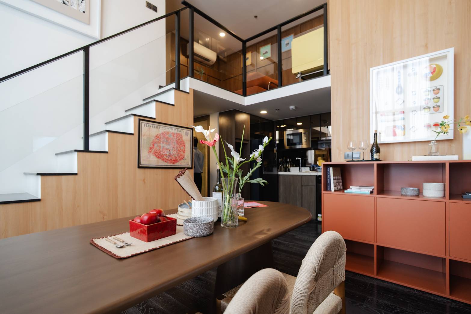 ห้องตัวอย่างที่ 2 “Living Canvas of Quiet Craft” ถ่ายทอดพื้นที่แห่งแรงบันดาลใจของช่างทำขนมปังผู้รักอิสระ ผ่านการเล่าเรื่องของ Baker ผู้หลงใหลในขนมปังซาวร์โดว์และงานฝีมือ การออกแบบเน้นบรรยากาศแบบ Handcrafted ที่เรียบง่ายแต่เปี่ยมด้วยเอกลักษณ์ โดยปรับพื้นที่ชั้นล่างของห้องแบบ Duo Space ให้กลายเป็นสตูดิโอส่วนตัว ใช้โทนสีไม้ที่อบอุ่น ผสานกับเฟอร์นิเจอร์ดีไซน์มินิมอลเท่ๆ สร้างพื้นที่ส่วนตัวที่ตัดขาดจากความวุ่นวายภายนอก