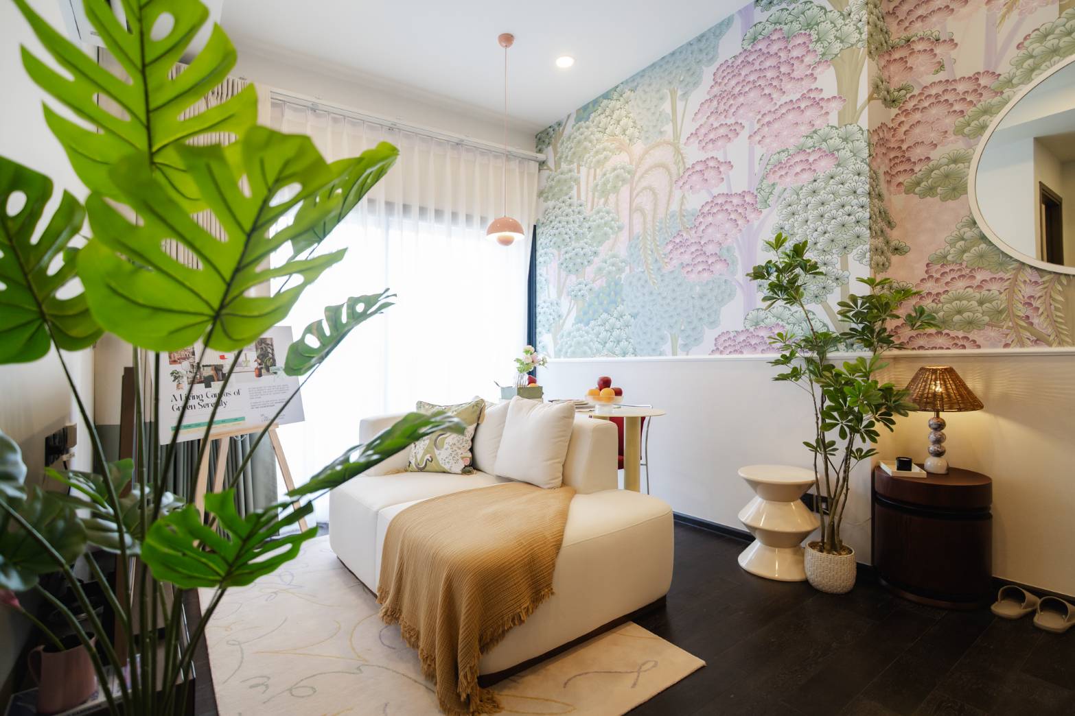 ห้องตัวอย่างแรก “Living Canvas of Green Serenity” เสนอแนวคิดการอยู่อาศัยที่ผสานพลังแห่งธรรมชาติเพื่อผู้บริหารหญิง แต่ยังคงแสวงหาความสงบและความอ่อนโยน พื้นที่ถูกออกแบบภายใต้แนวคิด Biophilic Design ด้วยการนำองค์ประกอบธรรมชาติเข้ามาเป็นส่วนหนึ่งของการใช้ชีวิต ไม่ว่าจะเป็นลวดลายพฤกษาอย่างเฟิร์น (Ferns) และวอลเปเปอร์ทิวทัศน์ชนบท ควบคู่กับโทนสีขาวนวลที่ให้ความรู้สึกโปร่งสบาย และการจัดวางสีเขียวจากต้นไม้ เพื่อเยียวยาจิตใจและเติมพลัง
