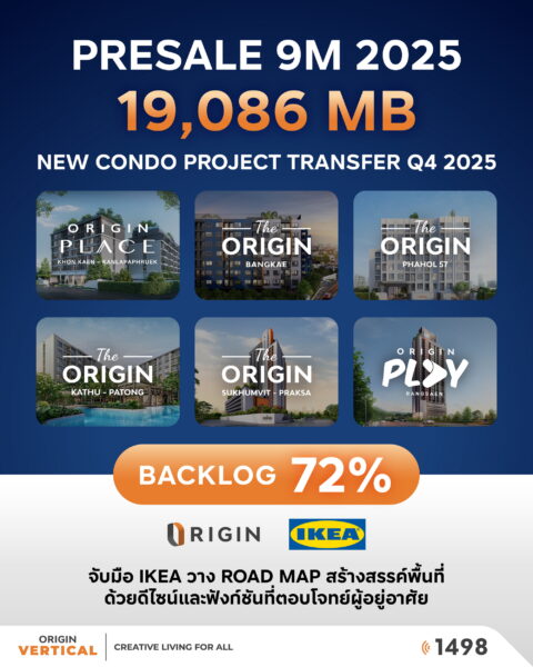 บริษัทฯ มีโครงการคอนโดฯ ที่เสร็จใหม่และเริ่มทยอยโอนกรรมสิทธิ์ ในช่วงไตรมาส 4/2568 จำนวน 6 โครงการ คือ ออริจิ้น เพลส ขอนแก่น กัลปพฤกษ์, ดิ ออริจิ้น บางแค, ดิ ออริจิ้น พหล57, ดิ ออริจิ้น กะทู้ – ป่าตอง, ดิ ออริจิ้น สุขุมวิท แพรกษา และ ออริจิ้น เพลย์ บางแสน ซึ่งมีแบ็คล็อคคอนโดฯรวมแล้วกว่า 72% ของมูลค่าโครงการ ขณะเดียวกันกลุ่มบริษัทฯ ได้ร่วมมือกับ อิเกีย ประเทศไทย แบรนด์เฟอร์นิเจอร์ และของแต่งบ้านระดับโลก (Global Brand) ร่วมสร้างสรรค์พื้นที่อยู่อาศัย ตอบโจทย์ทุกมิติการใช้ชีวิตของคนรุ่นใหม่ คิกออฟโครงการแรก Origin Plug & Play E22 Station คอนโดใหม่เลี้ยงสัตว์ได้ ติด BTS สายสีเขียว สถานีสายลวด เพียงแค่ 0 เมตร* พร้อมเตรียมแผนขยายห้องแต่ง Ready to move อีกหลายโครงการ หลายทำเลศักยภาพทั้งในกรุงเทพ และต่างจังหวัด