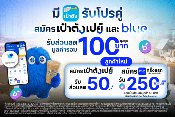 • ต่อที่ 1 รับ bluepoint 250 คะแนน เมื่อสมัครสมาชิก blueplus+ ผ่านแอปฯ เป๋าตัง และล็อกอินที่แอปฯ blueplus+ ครั้งแรก** ตั้งแต่วันที่ 3 ธันวาคม 2568 – 31 มกราคม 2569 จะได้รับคะแนน bluepoint 250 คะแนน เทียบเท่ามูลค่า 50 บาท ใช้แลกเครื่องดื่มมูลค่า 50 บาท ได้ฟรี 1 แก้ว ที่ร้าน Café Amazon ทุกสาขา ตลอดระยะเวลากิจกรรมส่งเสริมการขาย