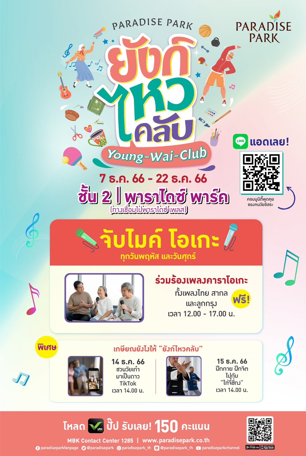 พาราไดซ์ พาร์ค ศูนย์การค้าในเครือเอ็ม บี เค จัดงาน “ยังก์ ไหว คลับ” (Young Wai Club) เอาใจวัยอิสระอย่างต่อเนื่อง โดยในเดือนธันวาคมนี้ ทุกวันพฤหัสบดีและวันศุกร์ พบกับกิจกรรมร้องคาราโอเกะสุดชิค “จับไมค์ โอเกะ” เพลิดเพลินกับร้องเพลงคาราโอเกะ ทั้งไทย สากล และลูกกรุง พร้อมชมโชว์จากชมรมวิกปากน้ำ ที่มาขับกล่อมบทเพลงวันวานที่คงอยู่ในความทรงจำ พลาดไม่ได้! กับกิจกรรมสุดพิเศษ ชวนวัยเก๋ามาเป็นดาว TikTok และ ฝึกกายฝึกจิตไปกับ “ไท่จี๋ชี่กง” มาร่วมกิจกรรมสร้างสรรค์และผ่อนคลายในวันว่าง เพลิดเพลินกับชมโชว์ร้องเพลง ร้องคาราโอเกะสุดชิค และมาเป็นดาว TikTok ตั้งแต่วันพฤหัสบดีที่ 7 – วันศุกร์ที่ 22 ธัวาคม 2566 ณ บริเวณชั้น 2 (ทางเชื่อมไปพาราไดซ์ เพลส) ศูนย์การค้าพาราไดซ์ พาร์ค