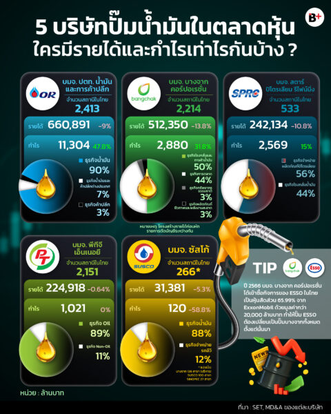 Infographic นี้พาไปดูรายได้และกำไรปี 2568 ไปจนถึงโครงสร้างรายได้ของบริษัทเจ้าของปั๊มน้ำมันที่อยู่ในตลาดหุ้นของไทย โดยมีผู้เล่นหลักอยู่ 5 แห่ง