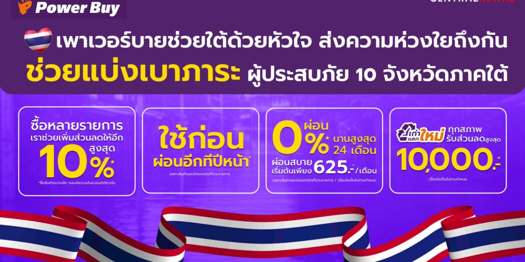ในช่วงฟื้นฟูหลังน้ำลด เพาเวอร์บายยังคงเดินหน้าส่งมอบความช่วยเหลือแก่ผู้ประสบภัยใน 10 จังหวัดภาคใต้ โดยจัดบริการตรวจเช็กสภาพและซ่อมแซมเครื่องใช้ไฟฟ้าที่เสียหายจากน้ำท่วมโดยช่างผู้เชี่ยวชาญถึงบ้าน พร้อมมอบส่วนลดค่าอะไหล่สูงสุด 50% เพื่อช่วยลดภาระค่าใช้จ่ายของประชาชนที่ต้องเร่งฟื้นฟูบ้านเรือน และสามารถติดต่อขอรับบริการได้ที่สาขาใกล้บ้านหรือศูนย์บริการลูกค้าสัมพันธ์ 1324 ตั้งแต่วันนี้ถึง 31 ธ.ค. 68 อีกทั้งยังช่วยบรรเทาค่าใช้จ่ายด้านเครื่องใช้ไฟฟ้า มอบส่วนลดพิเศษสำหรับการซื้อสินค้าใหม่สูงสุด 10,000 บาท เมื่อ นำเครื่องใช้ไฟฟ้าเก่าทุกสภาพมาแลก พร้อมทางเลือกผ่อน 0% นานสูงสุด 24 เดือน “ซื้อวันนี้ จ่ายปีหน้า” กับบัตรเครดิตที่ร่วมรายการ รวมถึงมอบส่วนลดเพิ่มอีก 10% เมื่อซื้อสินค้าหลายชิ้น เพื่อช่วยให้ประชาชนสามารถกลับมาดำเนินชีวิตได้ตามปกติโดยเร็ว