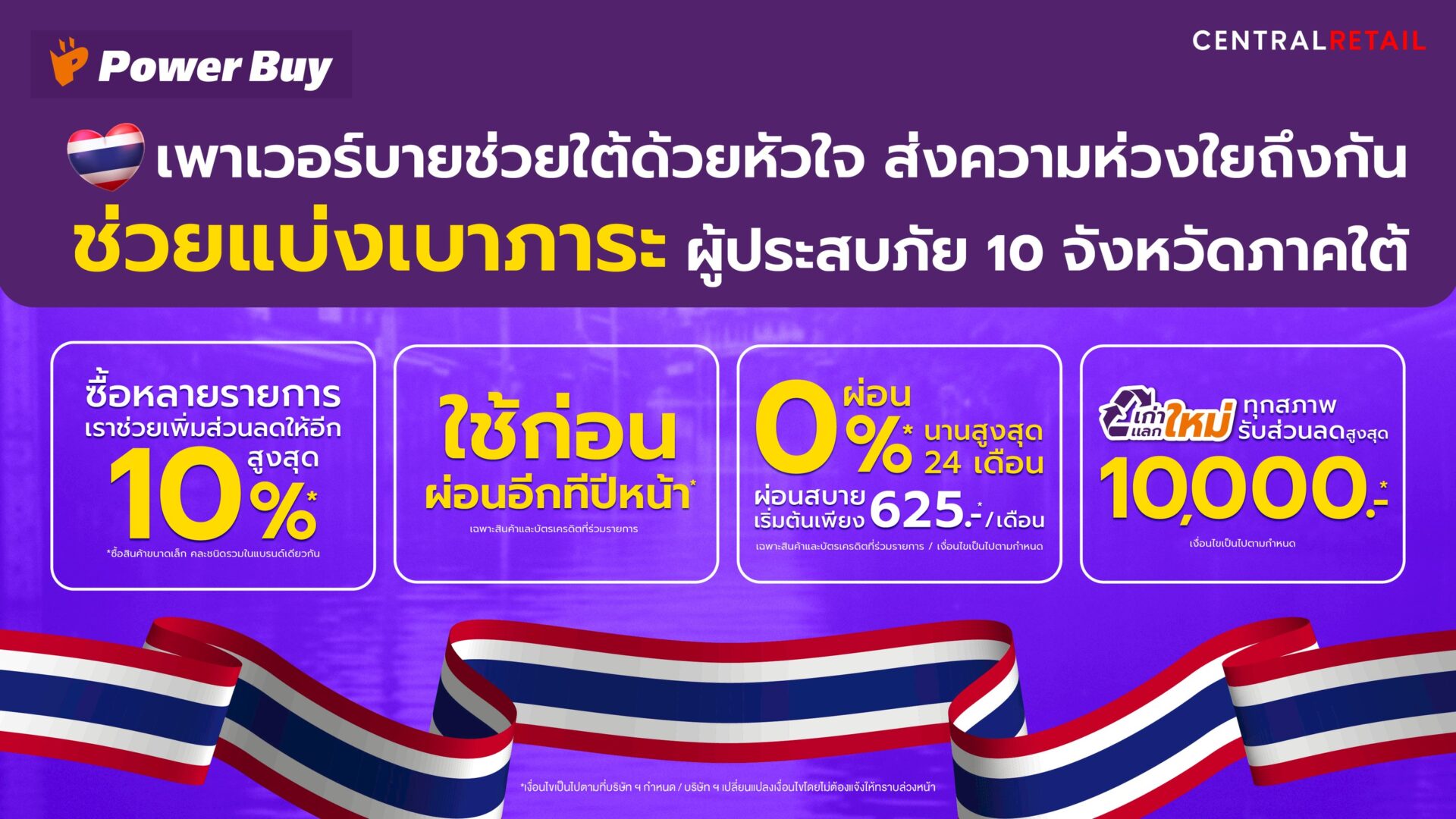 ในช่วงฟื้นฟูหลังน้ำลด เพาเวอร์บายยังคงเดินหน้าส่งมอบความช่วยเหลือแก่ผู้ประสบภัยใน 10 จังหวัดภาคใต้ โดยจัดบริการตรวจเช็กสภาพและซ่อมแซมเครื่องใช้ไฟฟ้าที่เสียหายจากน้ำท่วมโดยช่างผู้เชี่ยวชาญถึงบ้าน พร้อมมอบส่วนลดค่าอะไหล่สูงสุด 50% เพื่อช่วยลดภาระค่าใช้จ่ายของประชาชนที่ต้องเร่งฟื้นฟูบ้านเรือน และสามารถติดต่อขอรับบริการได้ที่สาขาใกล้บ้านหรือศูนย์บริการลูกค้าสัมพันธ์ 1324 ตั้งแต่วันนี้ถึง 31 ธ.ค. 68 อีกทั้งยังช่วยบรรเทาค่าใช้จ่ายด้านเครื่องใช้ไฟฟ้า มอบส่วนลดพิเศษสำหรับการซื้อสินค้าใหม่สูงสุด 10,000 บาท เมื่อ นำเครื่องใช้ไฟฟ้าเก่าทุกสภาพมาแลก พร้อมทางเลือกผ่อน 0% นานสูงสุด 24 เดือน “ซื้อวันนี้ จ่ายปีหน้า” กับบัตรเครดิตที่ร่วมรายการ รวมถึงมอบส่วนลดเพิ่มอีก 10% เมื่อซื้อสินค้าหลายชิ้น เพื่อช่วยให้ประชาชนสามารถกลับมาดำเนินชีวิตได้ตามปกติโดยเร็ว