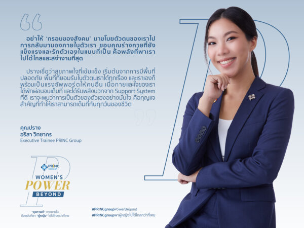 คุณอริสา วิทยากร Executive Trainee บริษัท พริ้นซิเพิล แคปิตอล จำกัด (มหาชน) หรือ PRINC Group กล่าวว่า “สำหรับคุณปราง การเติบโตไม่ได้เริ่มจากการพยายามเป็นใคร แต่เริ่มจากการกลับมาเข้าใจและยอมรับตัวเองในแบบที่เป็น และเชื่อว่าสุขภาพใจที่แข็งแรง คือพื้นฐานสำคัญของการใช้ชีวิต เพราะเมื่อเรามีพื้นที่ปลอดภัยให้ตัวเอง ได้พัก ได้ฟัง และได้ยอมรับความรู้สึกของตัวเองอย่างแท้จริง เราจะสามารถก้าวไปข้างหน้าได้อย่างมั่นคง ซึ่งการเป็นตัวของตัวเอง ไม่ใช่การต่อต้านกรอบของสังคม แต่คือการเลือกยืนอยู่ในแบบที่เราสบายใจ และมั่นใจในคุณค่าของตัวเอง