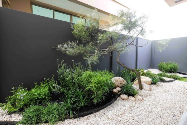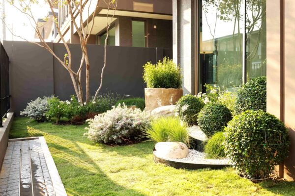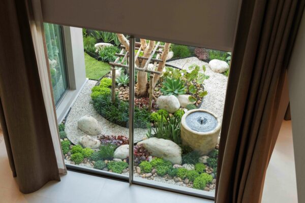 การออกแบบสวนได้นำแนวคิดการจัดสวนในสไตล์ Exotic DUKE Signature มาผสานเข้ากับสถาปัตยกรรมของโครงการอย่างลงตัว โดยมองพื้นที่สวนเสมือน งานศิลปะที่วาดขึ้นด้วยธรรมชาติ” ใช้พรรณไม้ที่หลากหลาย ก้อนหิน กรวด และองค์ประกอบของน้ำ ถ่ายทอดเส้นสาย สีสัน และเลเยอร์ของพื้นที่ให้มีชีวิต พร้อมใช้โทนสีธรรมชาติอย่าง       สีเขียวของหญ้า สีขาวของกรวด และพื้นผิวของหิน มาช่วยแบ่งโซนให้สวนดูสะอาดตา ผสมผสานระหว่างไม้ใบรูปทรงสวยงาม ไม้แปลกตาที่ช่วยสร้างคาแรกเตอร์และกลมกลืนกับสถาปัตยกรรมของบ้าน เติมเต็มบรรยากาศโดยรวมให้ดูเป็นธรรมชาติ เกิดเป็นสวนที่มีทั้งความร่วมสมัย ความดราม่า และเสน่ห์ของความเป็นทรอปิคัลในแบบที่ไม่จำเจ ทำให้เมื่อก้าวผ่านทางเข้าสู่บ้าน พื้นที่ภายในจะค่อย ๆ เปิดมุมมองไปสู่ Courtyard กลางบ้าน ผู้อยู่อาศัยจะได้สัมผัสบรรยากาศธรรมชาติอย่างใกล้ชิด ทั้งเสียงน้ำ เงาของกิ่งไม้ และสีสันของพรรณไม้ที่เปลี่ยนไปตามช่วงเวลา ช่วยสร้างความรู้สึกผ่อนคลายและเติมเต็มคุณภาพชีวิตในทุกวัน สะท้อนแนวคิดการอยู่อาศัยซึ่งผสานธรรมชาติ ความเป็นส่วนตัว และสุขภาวะที่ดี ทำให้ “บ้าน” เป็นพื้นที่แห่งความสงบและแรงบันดาลใจ เพื่อยกระดับประสบการณ์การใช้ชีวิตในแบบ Modern Tropical Courtyard Living อย่างแท้จริง
