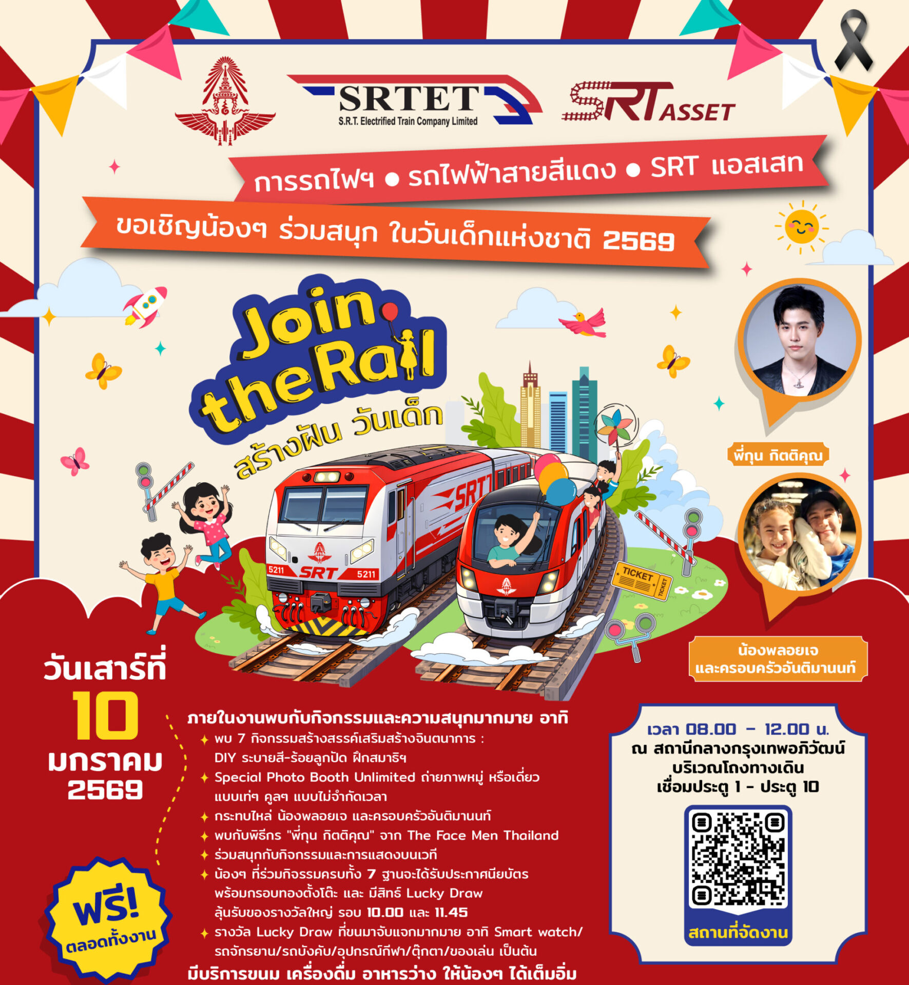 นายสุเทพ พันธุ์เพ็ง กรรมการผู้อำนวยการใหญ่ บริษัท รถไฟฟ้า ร.ฟ.ท. จำกัด ผู้ให้บริการรถไฟฟ้าชานเมืองสายสีแดง เปิดเผยว่า รถไฟฟ้าชานเมืองสายสีแดง บูรณาการความร่วมมือกับ การรถไฟแห่งประเทศไทย และบริษัท เอสอาร์ที แอสเสท จำกัด จัดกิจกรรมสุดพิเศษ เนื่องในโอกาสวันเด็กแห่งชาติ ภายใต้แคมเปญ Join the Rail สร้างฝัน วันเด็ก ในวันเสาร์ที่ 10 มกราคม 2569 ตั้งแต่เวลา 08.00 – 12.00 น. ณ สถานีกลางกรุงเทพอภิวัฒน์ บริเวณโถงทางเดินเชื่อมประตู 1 – ประตู 10 โดยน้องๆทุกคนจะได้ร่วมสนุกกับกิจกรรมต่างๆภายในงาน ประกอบด้วย 7 ฐานกิจกรรมที่จะช่วยเสริมสร้างความรู้และจินตนาการ ซึ่งหากเข้าร่วมกิจกรรมครบทั้ง 7 ฐาน จะได้รับประกาศนียบัตรใส่กรอบทองสำหรับตั้งโต๊ะ พร้อมลุ้นรับของรางวัลใหญ่แบบจัดเต็ม อาทิ Smart Watch , รถจักรยาน , รถบังคับ และอุปกรณ์กีฬา เป็นต้น นอกจากนี้ยังมี Special Photo Booth ให้น้องๆได้ถ่ายภาพน่ารักๆแบบไม่จำกัด อีกทั้งยังได้กระทบไหล่กับน้องพลอยเจ และคุณเจจินตัย อันติมานนท์ รวมถึงพิธีกรรับเชิญสุดพิเศษ พี่กุน กิตติคุณ จาก The Face Men Thailand นอกจากนี้ภายในงานยังมีบริการขนม อาหารว่าง และเครื่องดื่มให้แก่น้องๆที่เข้าร่วมงานทุกคน โดยไม่มีค่าใช้จ่ายใดๆทั้งสิ้น ซึ่งบริษัทฯหวังเป็นอย่างยิ่งว่า กิจกรรมดังกล่าวจะสามารถสร้างความสุข ความสนุก และรอยยิ้มให้แก่น้องๆทุกคนในโอกาสวันเด็กแห่งชาติได้อย่างแน่นอน