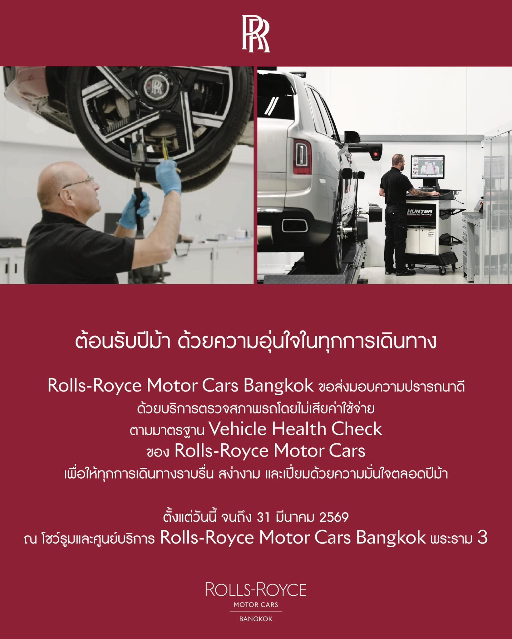นอกจากนี้ โรลส์-รอยซ์ มอเตอร์ คาร์ส แบงคอก ขอส่งมอบความอุ่นใจ ห่วงใยในทุกการเดินทาง ด้วยบริการตรวจสภาพรถตามมาตรฐาน Vehicle Health Check ของ โรลส์-รอยซ์ มอเตอร์ คาร์ส โดยไม่คิดค่าใช้จ่าย เพื่อให้ทุกเส้นทางของท่านราบรื่น สง่างาม เปี่ยมด้วยความมั่นใจ พร้อมขอเชิญลูกค้าที่นำรถเข้ามารับบริการ สมัครเป็นสมาชิก Whispers เพื่อรับสิทธิประโยชน์หลากหลาย รวมถึงประสบการณ์ที่หรูหราเหนือระดับ ตั้งแต่วันนี้ถึง 31 มีนาคม 2569 ที่โชว์รูมและศูนย์บริการ โรลส์-รอยซ์ มอเตอร์ คาร์ส แบงคอก พระราม 3