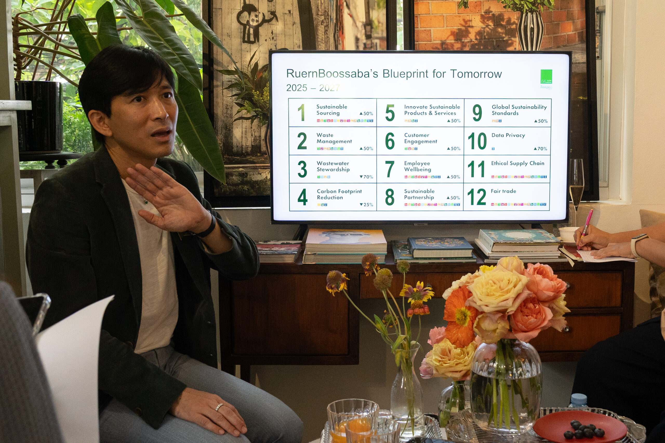 ภายใต้แผน RuernBoossaba’s Blueprint for Tomorrow 2025–2027 บริษัทได้กำหนดทิศทางการพัฒนาองค์กรผ่าน 12 เป้าหมายหลักด้าน ESG ครอบคลุมประเด็นสำคัญ ได้แก่ การจัดหาวัตถุดิบอย่างยั่งยืน การบริหารจัดการของเสีย การจัดการน้ำเสีย การลดคาร์บอนฟุตพริ้นท์ การพัฒนาผลิตภัณฑ์และบริการที่เป็นมิตรต่อสิ่งแวดล้อม การสร้างความผูกพันกับลูกค้า การดูแลพนักงาน การสร้างความร่วมมือด้านความยั่งยืน ตลอดจนการยกระดับมาตรฐานด้านธรรมาภิบาล เช่น การคุ้มครองข้อมูลส่วนบุคคลและการพัฒนาห่วงโซ่อุปทานที่มีจริยธรรม