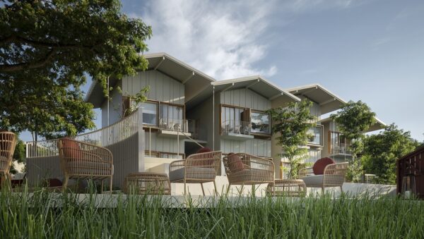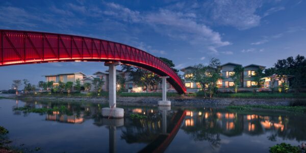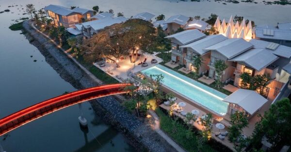 ร่วมสมัย สร้างสรรค์จากวัสดุท้องถิ่นต่างๆ อย่างผ้าโปร่ง อิฐ ไม้ธรรมชาติ และงานจักสาน มอบบรรยากาศที่เรียบง่ายผ่อนคลาย และเป็นกันเอง โดยตัวอาคารได้รับการออกแบบให้มีขนาดสอดคล้องกับบ้านเรือนโดยรอบ โอบล้อมด้วยต้นไม้เขียวขจี และต้นจามจุรีสูงใหญ่ที่ได้รับการอนุรักษ์ไว้เป็นอย่างดี ควบคู่กับการมอบความสะดวกสบายและฟังก์ชันการใช้งานที่ทันสมัยครบครัน แขกที่มาเยือนจะได้รับการต้อนรับบริเวณพื้นที่ล็อบบี้ที่โปร่งสบาย แต่งแต้มด้วยสีแดงอันสดใส ใต้อาคารไม้ยกพื้นสูง พร้อมด้วยแลนด์มาร์กสำคัญที่กลายเป็นสัญลักษณ์ประจำบูติกรีสอร์ทแห่งนี้ คือสะพานสีแดงทอดข้ามแม่น้ำ ที่มีสีสันโดดเด่น แต่ก็กลมกลืนไปกับบริบทของหมู่บ้าน ทำหน้าที่เชื่อมพื้นที่สองฝั่ง และแฝงถึงการเชื่อมโยงระหว่างสถาปัตยกรรมสมัยใหม่กับวิถีชุมชนท้องถิ่นริมฝั่งน้ำได้เป็นอย่างดี
