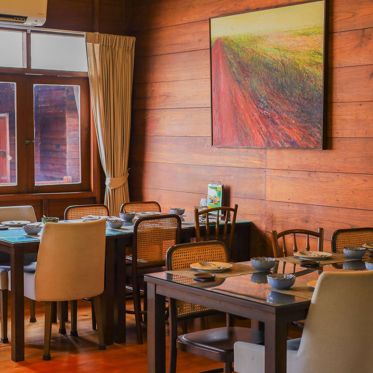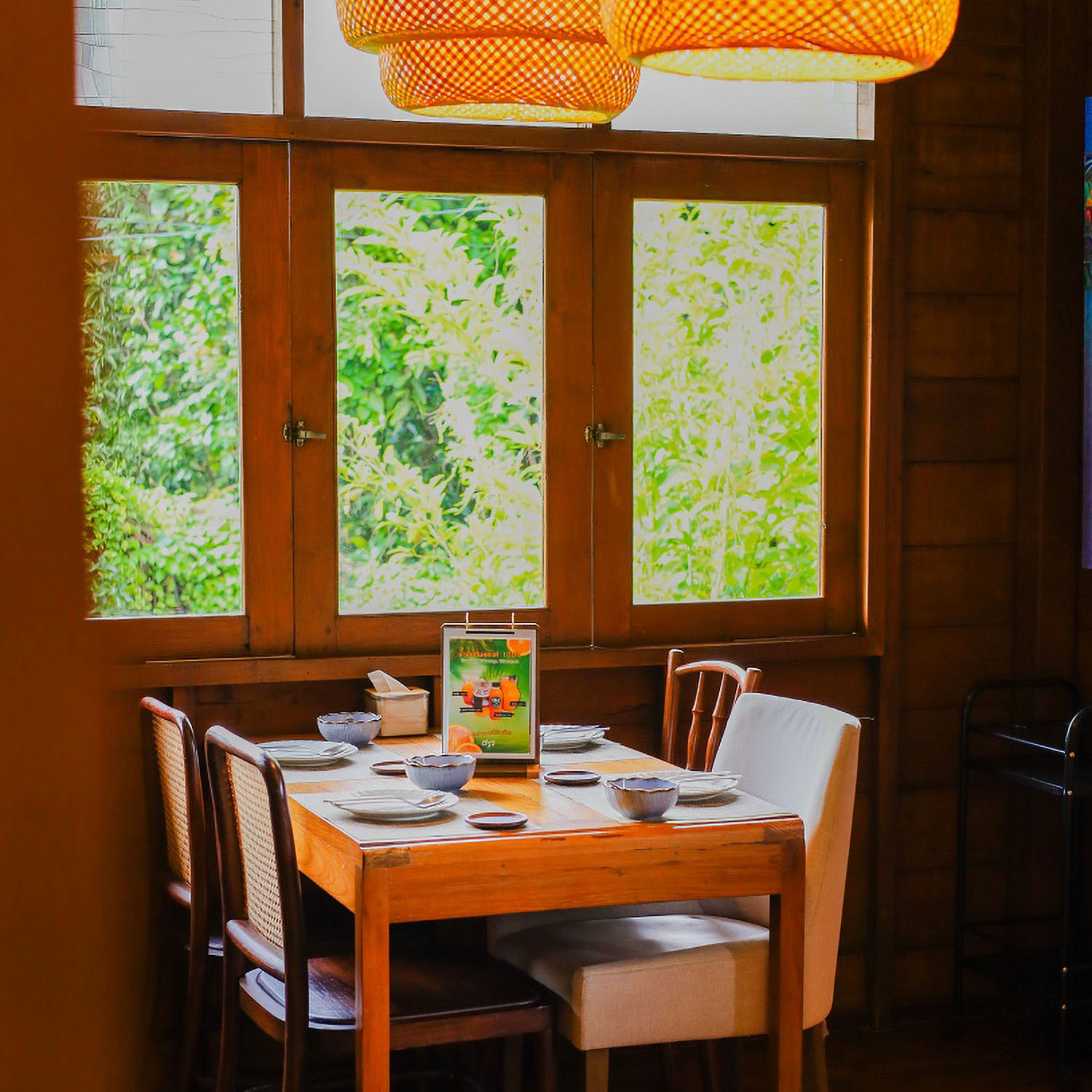 ภายในร้านยังคงเอกลักษณ์ของความเรียบง่าย แต่เต็มไปด้วยรายละเอียดที่ตั้งใจคัดสรร ทุกมุมถูกจัดแต่งอย่างสวยงามด้วยเครื่องใช้และของตกแต่งโทนไม้อย่างพอดี ๆ ทำให้ผู้มาเยือนรู้สึกเหมือนกำลังก้าวเข้าสู่บ้านของคนเพชรบุรีจริง ๆ ด้วยบรรยากาศอบอุ่น เป็นกันเอง แบบบ้านสวนที่หาได้ยากในเมืองใหญ่