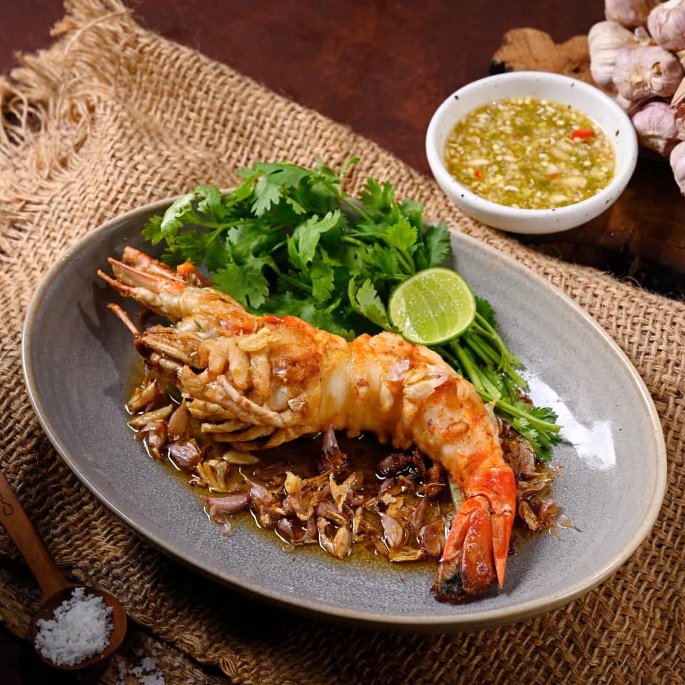 หรืออีกเมนูคือ กุ้งแม่น้ำทอดดอกเกลือ ที่ใช้กุ้งตัวโตมาทอดให้เนื้อกรอบนอกเด้งใน ปรุงด้วยดอกเกลือที่ขับให้รสหวานมันของกุ้งกลมกล่อมยิ่งขึ้น เสิร์ฟพร้อมกระเทียมไทยเจียวกรอบ เหมาะสำหรับรับประทานคู่กับข้าวหอมมะลิร้อน ๆ
