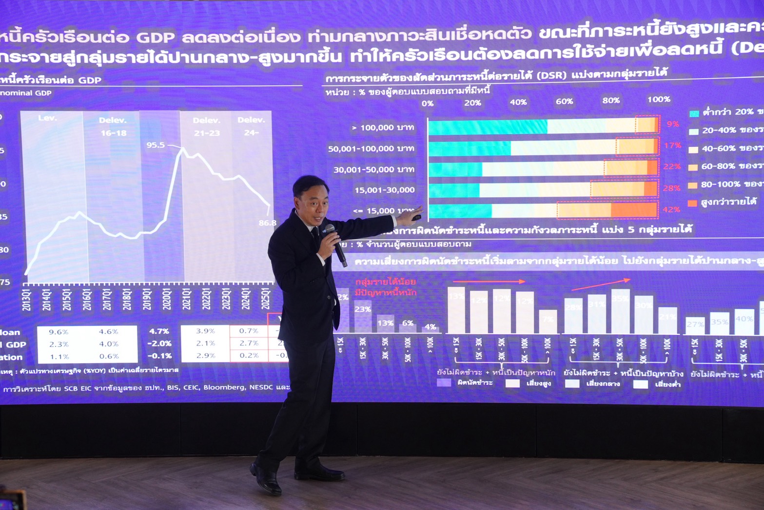 - การบริโภคภาคเอกชนจะได้รับผลกระทบจากความเปราะบางด้านรายได้และหนี้ครัวเรือนอย่างไร? รายได้แรงงานโตช้า ท่ามกลางตลาดแรงงานและความเชื่อมั่นผู้บริโภคที่เปราะบางขึ้น จากแนวโน้มเศรษฐกิจที่มีปัจจัยเสี่ยงมากขึ้น ขณะที่ภาระหนี้ครัวเรือนเมื่อเทียบกับรายได้ยังอยู่ในระดับสูง และความเสี่ยงการชำระหนี้ที่เริ่มกระจายไปยังกลุ่มรายได้กลาง-สูงมากขึ้น ครัวเรือนจึงมีแนวโน้มระมัดระวังการใช้จ่ายท่ามกลางกระบวนการลดหนี้ที่เกิดขึ้นต่อเนื่อง (Debt deleveraging)