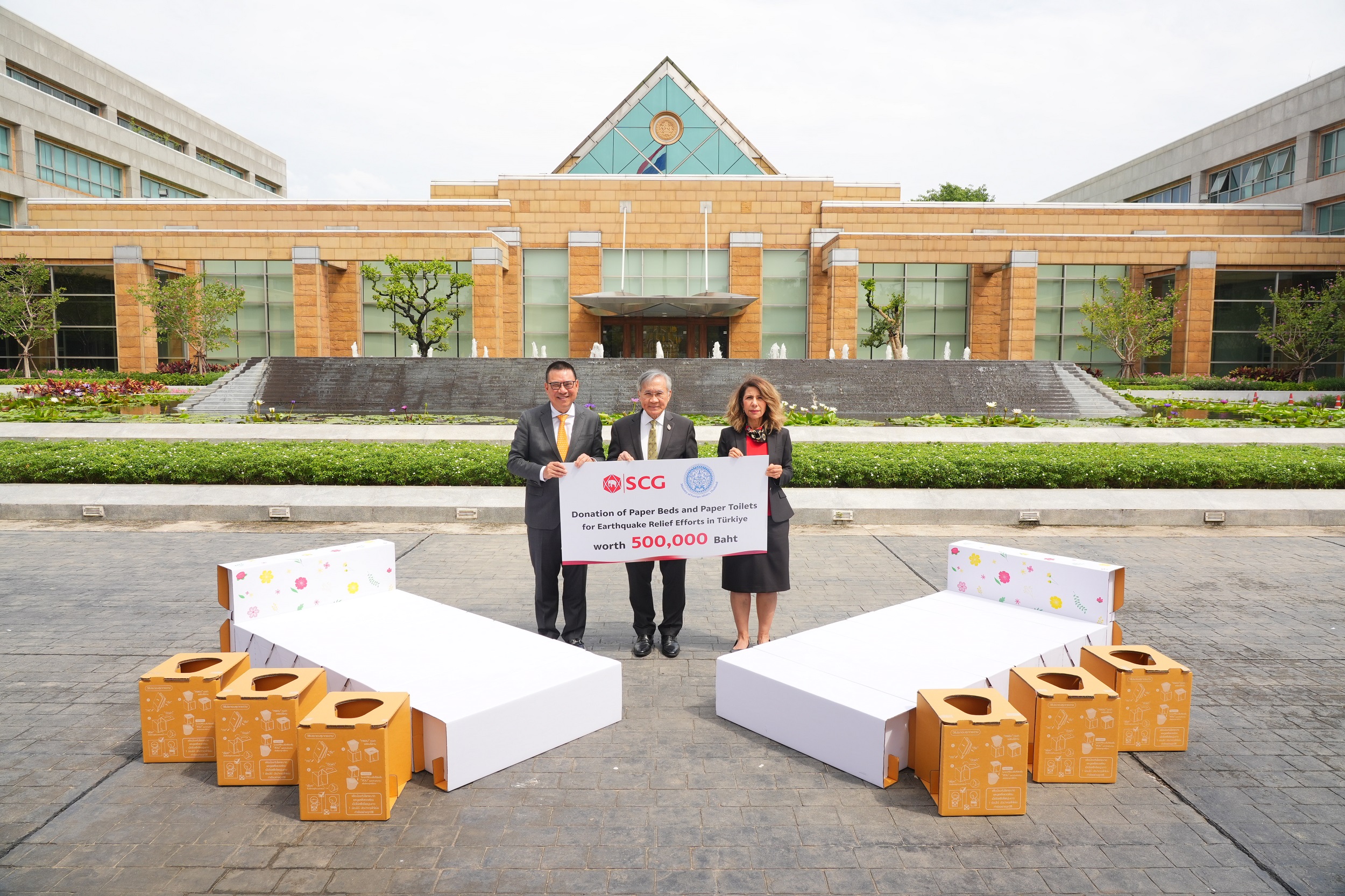 นายดอน ปรมัตถ์วินัย รองนายกรัฐมนตรีและรัฐมนตรีว่าการกระทรวงการต่างประเทศ และนายรุ่งโรจน์ รังสิโยภาส กรรมการผู้จัดการใหญ่ เอสซีจี ร่วมส่งมอบนวัตกรรมเตียงสนามกระดาษและสุขากระดาษเอสซีจีพี ช่วยเหลือผู้ประสบภัยจากเหตุแผ่นดินไหวในตุรกี โดยมีนางแซรัป แอร์ซอย เอกอัครราชทูตสาธารณรัฐตุรกีประจำประเทศไทย เป็นผู้รับมอบ เพื่อนำไปช่วยเหลือผู้ประสบภัยจากเหตุแผ่นดินไหวรุนแรง ณ จังหวัดคาห์รามันมาราช และจังหวัดใกล้เคียง