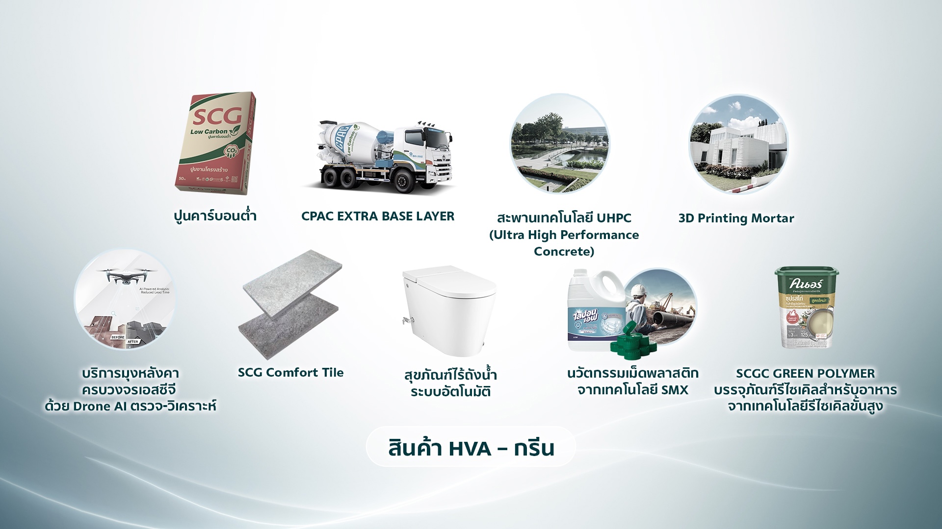 ปูนคาร์บอนต่ำ ปูนคาร์บอนต่ำ อยู่ระหว่างพัฒนาปูนคาร์บอนต่ำรุ่นใหม่ Generation 3 ที่ลดคาร์บอนไดออกไซด์ได้ถึง 38% โดยเตรียมปรับกำลังการผลิต 2 ล้านตัน/ปี ภายในปี 2570 ที่จ.สระบุรี และ CPAC Extra Base Layer นวัตกรรมซ่อม-สร้างถนนลดการยุบตัวและคงตัวทนนานจากการกัดเซาะน้ำ สะพาน UHPC (Ultra High Performance Concrete) สมรรถนะสูง ลดเวลาก่อสร้างได้ถึง 50% 3D Printing Mortar เทคโนโลยีการขึ้นรูปอาคารก่อสร้างที่มีดีไซน์ซับซ้อน ขยายตลาดไปญี่ปุ่น ซาอุดิอาระเบีย และมาเลเซีย ยกระดับ Roof Installation บริการมุงหลังคาครบวงจรเอสซีจี ด้วย Drone AI ตรวจรอยรั่วหลังคาและวิเคราะห์โครงสร้างแบบ 3 มิติ ช่วยให้ซ่อมแซมรวดเร็ว ปลอดภัย และแม่นยำยิ่งขึ้น SCG Comfort Tile กระเบื้องซีเมนต์ปูพื้นรายแรกในไทย ที่ลดความร้อนสะสมได้ 3–7°C ด้วย HeatSync Technology ให้พื้นเย็น เดินสบาย สุขภัณฑ์ไร้ถังประหยัดน้ำ DUACT และแบบ “เคลือบจากเปลือกไข่–หอย” ลดการปล่อยก๊าซเรือนกระจก นวัตกรรมเม็ดพลาสติกจากเทคโนโลยี SMX ช่วยลดความหนาของผลิตภัณฑ์ลงโดยยังคงความแข็งแรง พัฒนาเป็นสินค้าหลากหลาย เช่น ท่ออุตสาหกรรมเหมืองแร่ขนาดใหญ่ ฝาขวดน้ำอัดลม ถังบรรจุสารเคมี และบรรจุภัณฑ์สินค้าอุปโภคบริโภค นวัตกรรมพลาสติกรีไซเคิล ทั้งเทคโนโลยีรีไซเคิลเชิงกล และเทคโนโลยีรีไซเคิลขั้นสูง ซึ่งใช้ผลิตเป็นบรรจุภัณฑ์ Food Grade ปลอดภัย ผ่านการรับรองมาตรฐาน ISCC PLUS ครอบคลุมตลอดห่วงโซ่อุปทาน