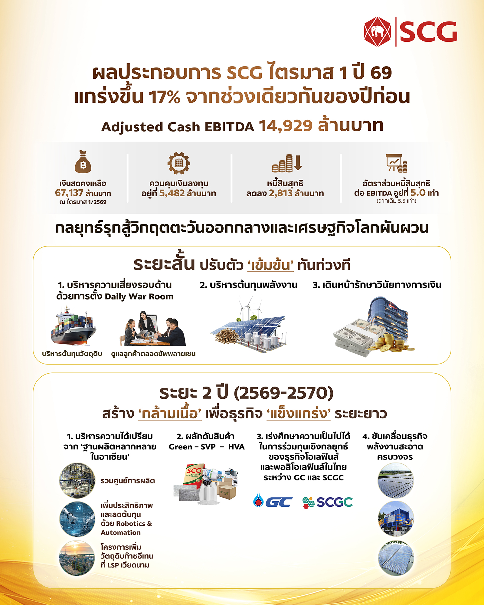 ผลประกอบการ SCG ไตรมาส 1 ปี 2569 มี Adjusted Cash EBITDA 14,929 ล้านบาท แกร่งขึ้น 17% จากช่วงเดียวกันของปีก่อน คาดสถานการณ์ตะวันออกกลางทำเศรษฐกิจโลกชะลอ ราคาพลังงาน วัตถุดิบผันผวนต่อ เร่งกลยุทธ์ “ระยะสั้น” บริหารต้นทุนวัตถุดิบ พลังงาน ดูแลลูกค้าต่อเนื่อง ด้วย Daily War Room ปรับตัวทันท่วงที พร้อมเดินหน้าวินัยการเงินเข้มข้น “ระยะ 2 ปี (2569-2570)” มุ่งสร้างความแข็งแกร่งระยะยาว บริหารความได้เปรียบจากฐานผลิตหลากหลายในอาเซียน ใช้ Robotics & Automation เดินหน้าโครงการ LSPE เวียดนาม คืบหน้าตามแผน – ผลักดันสินค้ากรีน & ราคาคุ้มค่า & มูลค่าเพิ่มสูง – เร่งศึกษาความเป็นไปได้ในการร่วมทุนเชิงกลยุทธ์ของธุรกิจโอเลฟินส์และพอลิโอเลฟินส์ในไทยระหว่าง GC และ SCGC – ขับเคลื่อนธุรกิจพลังงานสะอาดครบวงจร