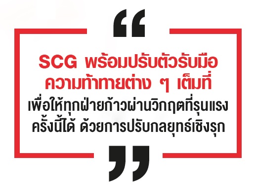 แต่ตอนนี้ภาคเอกชนที่เป็นลูกค้าของ SCG ส่วนหนึ่งเริ่มเห็นว่ามีความท้าทาย เช่น ธุรกิจอสังหาริมทรัพย์ ซึ่งการก่อสร้างส่วนใหญ่เป็นโครงการในระยะยาว ดังนั้น กำลังซื้อในระยะต่อไปที่มีการส่งมอบโครงการไปแล้วคงมีผลกระทบค่อนข้างมาก สิ่งที่คาดหวังคือโครงการของภาครัฐจะเข้ามามีส่วนพยุงให้ความต้องการสินค้าซีเมนต์และวัสดุก่อสร้างดำเนินต่อไปได้ อย่างน้อยจนกว่าสถานการณ์ Covid-19 จะคลี่คลาย”