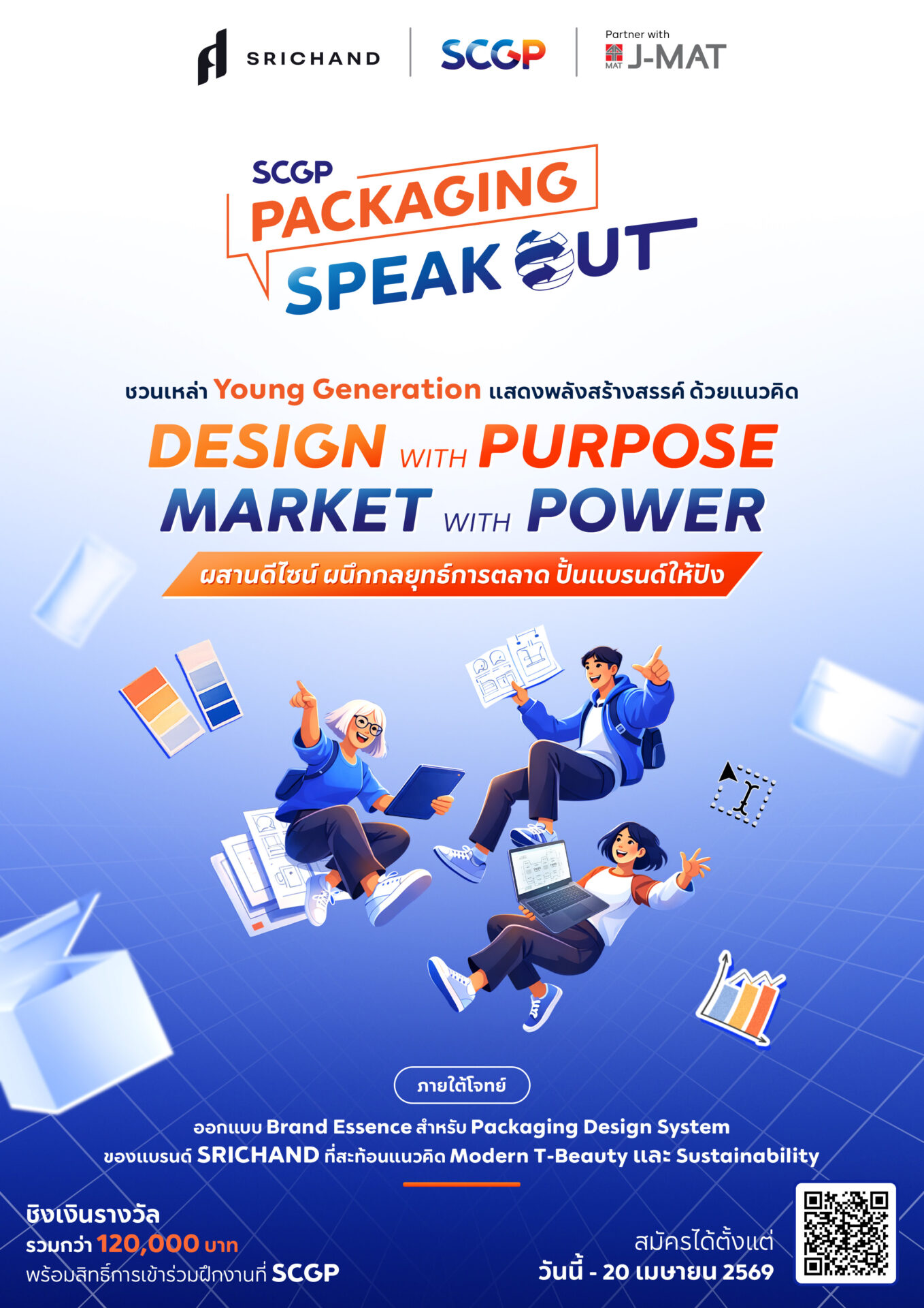 ผู้เข้าร่วมมีสิทธิ์ชิงรางวัลรวมมูลค่ากว่า 120,000 บาท และทีมชนะเลิศจะได้รับโอกาสฝึกงานกับ SCGP เพื่อพัฒนาศักยภาพสู่สายอาชีพในอนาคต ผู้ที่สนใจสามารถอ่านรายละเอียดและกติกา พร้อมสมัครและส่งผลงานได้ตั้งแต่วันนี้ – 20 เมษายน 2569 เวลา 17.00 น. ผ่านทางเว็บไซต์ https://sites.google.com/jmat.work/scgppackagingspeakout2026