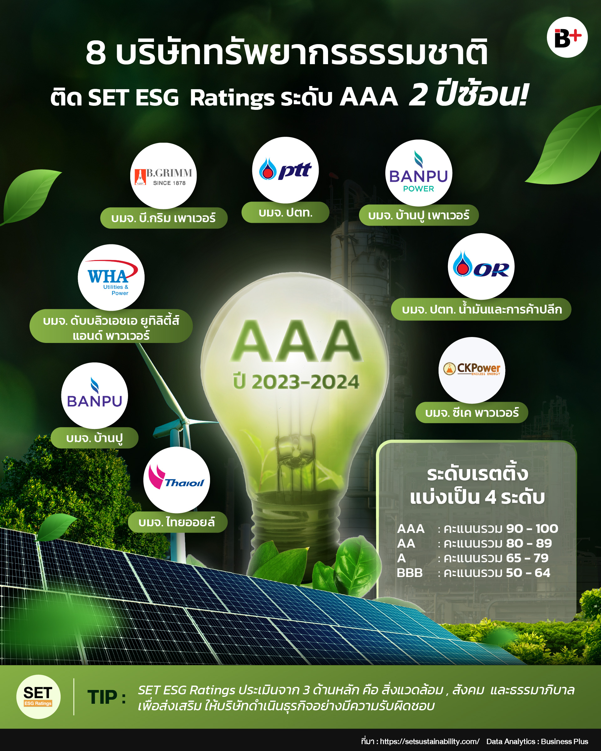 ซึ่งครั้งนี้ ‘Business Plus’ ได้ทำการสำรวจรายชื่อบริษัทที่ติดอันดับ SET ESG ระดับ AAA ขึ้นไปในกลุ่มอุตสาหกรรมทรัพยากรธรรมชาติ 2 ปีซ้อน ในระหว่างปี 2023-2024 โดยมีข้อมูลดังนี้
