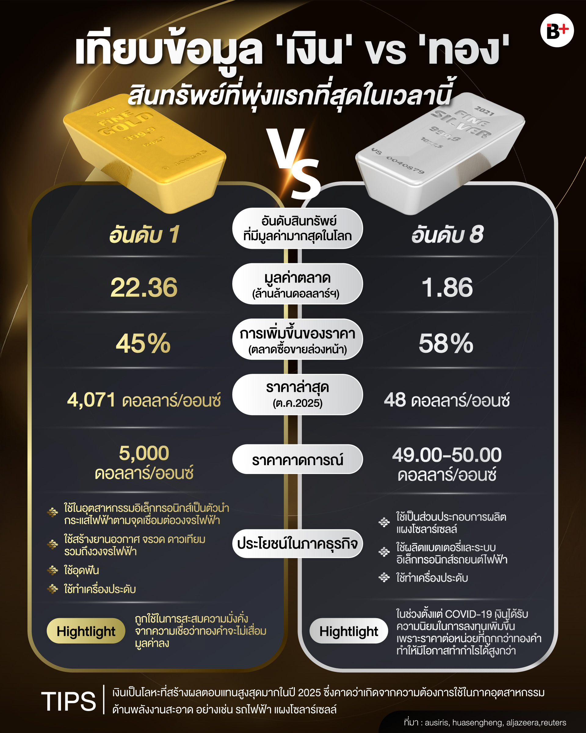 ทีนี้เรามาดูข้อมูลของเงิน เปรียบเทียบกับ ทอง กันว่าการปรับตัวและข้อมูลสำหรับการใช้เงินและทองแตกต่างกันอย่างไรผ่าน Infographic นี้