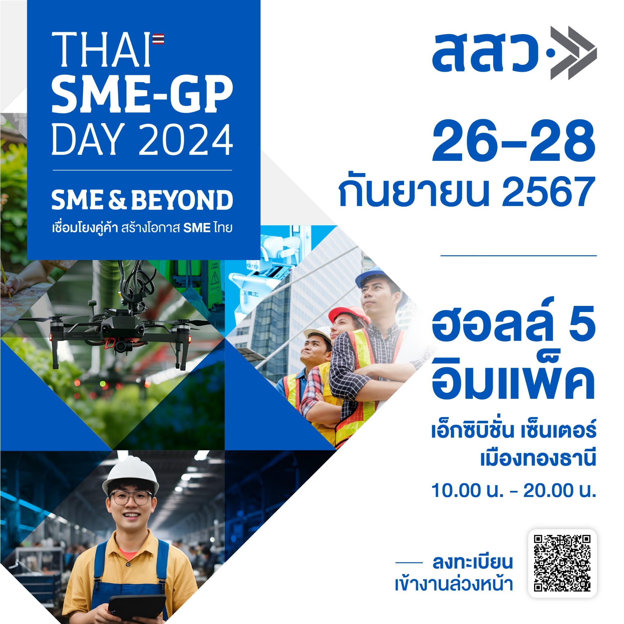 สำนักงานส่งเสริมวิสาหกิจขนาดกลางและขนาดย่อม หรือ สสว. เตรียมจัดงาน THAI SME-GP DAY 2024 งานมหกรรมยิ่งใหญ่ประจำปีระหว่างวันที่ 26-28 กันยายน นี้ ที่ฮอลล์ 5 ศูนย์แสดงสินค้าและการประชุม อิมแพ็ค เมืองทองธานี เพื่อเชื่อมโยงให้ผู้ประกอบการ SME ซึ่งเป็นผู้ขายสินค้า/บริการ ได้พบกับผู้ซื้อทั้งหน่วยงานภาครัฐและภาคเอกชน พร้อมสร้างโอกาสในการขยายตลาด ขณะเดียวกันยังเป็นช่องทางที่จะช่วยสร้างองค์ความรู้และแนวปฏิบัติในการจัดซื้อจัดจ้างที่ถูกต้องให้กับบุคลากรในหน่วยงานภาครัฐ ภาคเอกชนเพื่อให้ปฏิบัติหน้าที่ได้อย่างมีประสิทธิภาพและปลอดภัยจากการถูกตรวจสอบ โดยภายในงานจะมีกิจกรรมที่น่าสนใจมากมาย อาทิ THAI SME-GP พื้นที่แสดงผลงานของมาตรการฯ ข้อมูลความรู้เกี่ยวกับการจัดซื้อจัดจ้างภาครัฐ การขึ้นทะเบียน THAI SME-GP รวมถึงการแสดงผลงานของหน่วยงานที่ได้รับโล่ประกาศเกียรติคุณในการเป็นผู้สนับสนุนสินค้า/บริการของ SME ในระดับสูง, OSMEP Pavilion พื้นที่รวบรวมบริการของ สสว. เพื่อ SME อาทิ การขึ้นทะเบียน SME One ID การตรวจสุขภาพธุรกิจ และตรวจระดับการเป็นผู้ประกอบการ GREEN ที่ปรึกษาธุรกิจ มาตรการ SME ปัง ตังได้คืน และ platform บริการต่างๆ ของ สสว.