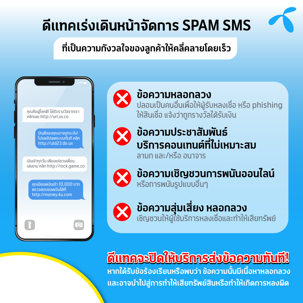 ทั้งนี้ ดีแทคมีขั้นตอนและกระบวนการในการตรวจสอบคัดกรองผู้ส่ง SMS อย่างเข้มงวด นับตั้งแต่เริ่มเปิดขอใช้บริการ หากได้รับข้อร้องเรียนหรือพบว่า ข้อความนั้นมีเนื้อหาหลอกลวงและอาจนำไปสู่การทำให้เสียทรัพย์สินหรือทำให้เกิดการหลงผิด ดีแทคจะทำการปิดการให้บริการส่งข้อความทันที ลักษณะเนื้อหาดังกล่าวได้แก่