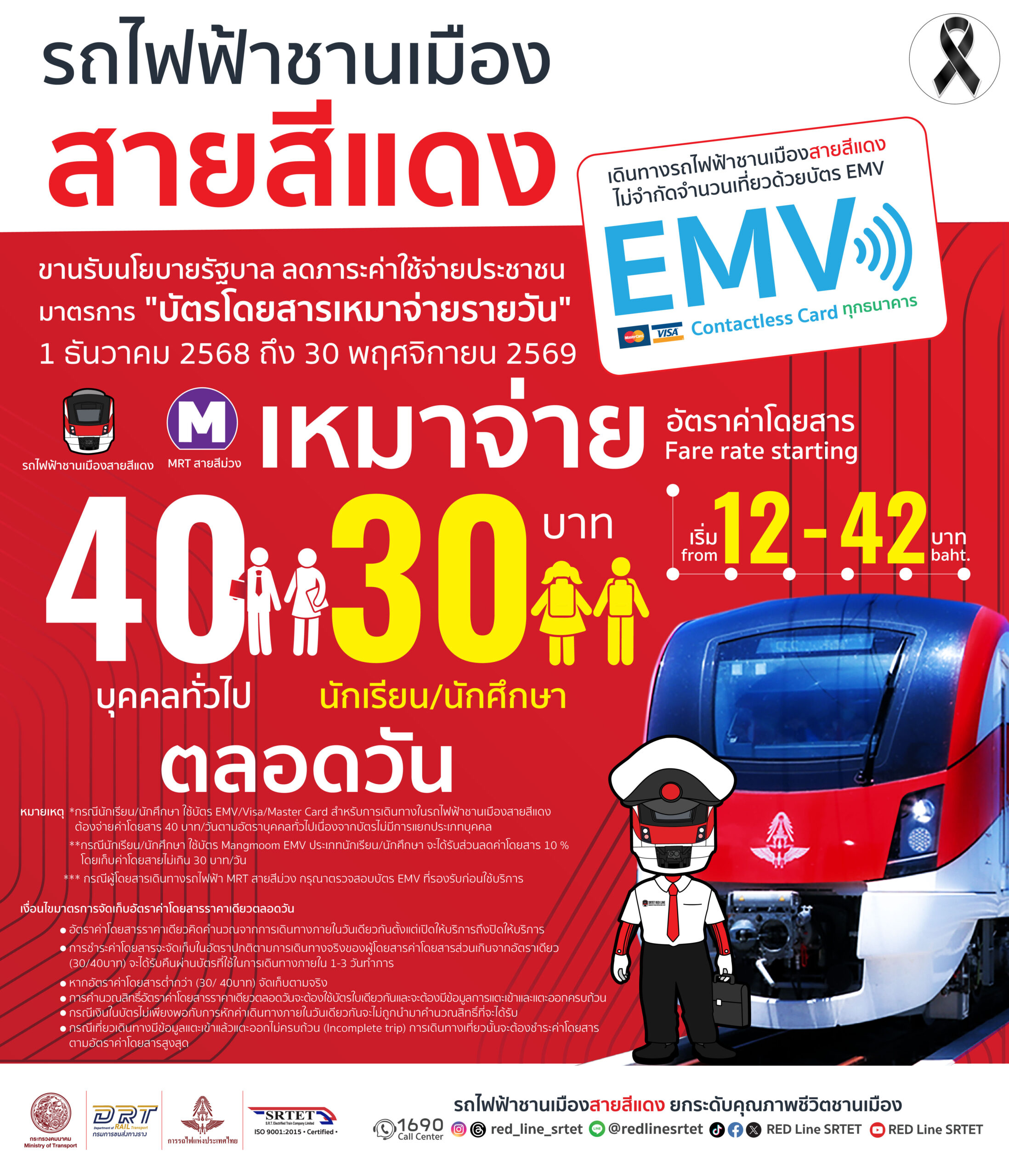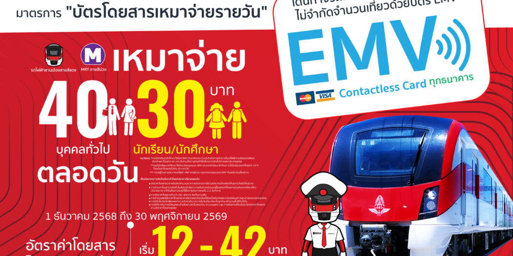 นายสุเทพ พันธุ์เพ็ง กรรมการผู้อำนวยการใหญ่ บริษัท รถไฟฟ้า ร.ฟ.ท. จำกัด ผู้ให้บริการรถไฟฟ้าชานเมืองสายสีแดง เปิดเผยว่า รฟฟท. พร้อมดำเนินการตามนโยบายรัฐบาล เพื่อช่วยลดภาระค่าใช้จ่ายให้แก่ประชาชน ”ดำเนินมาตรการ “บัตรโดยสารเหมาจ่ายรายวัน” สำหรับรถไฟชานเมืองสายสีแดง ทั้ง 2 เส้นทาง ได้แก่ สายธานีรัถยา ช่วงสถานีกลางกรุงเทพอภิวัฒน์ – สถานีรังสิต และสายนครวิถี ช่วงสถานีกลางกรุงเทพอภิวัฒน์ – สถานีตลิ่งชัน ร่วมกับ รถไฟฟ้ามหานคร สายฉลองรัชธรรม (MRT สายสีม่วง) โดยเตรียมจัดเก็บค่าโดยสารสูงสุด 40 บาท/วัน สำหรับประเภทบุคคลทั่วไป(Adult) และจัดเก็บค่าโดยสารสูงสุด 30 บาท/วัน สำหรับประเภทนักเรียน/นักศึกษา (Student) ซึ่งใช้บัตร MANGMOOM EMV บัตร EMV Contactless (บัตรเครดิต บัตรเดบิต) หรือ บัตร MRT EMV สำหรับเดินทางได้ทุกวัน ตั้งแต่เปิดให้บริการจนถึงปิดให้บริการ(05.00 – 24.00 น.) ซึ่งนโยบายดังกล่าวจะเริ่มใช้ตั้งแต่ วันที่ 1 ธันวาคม 2568 – 30 พฤศจิกายน 2569 หากผู้ใช้บริการมีการเดินทางในอัตราค่าโดยสารรวมทั้งวันต่ำกว่าอัตราเหมาจ่ายรายวัน จะจัดเก็บค่าโดยสารตามจริง และสำหรับกลุ่มผู้พิการ ผู้สูงอายุ เด็ก รวมถึงกลุ่มผู้ใช้สิทธิ์สวัสดิการแห่งรัฐ ยังคงได้รับส่วนลด หรือยกเว้นค่าโดยสารตามสิทธิประโยชน์เช่นเดิม