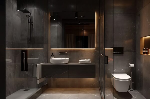 - สร้างมิติชวนค้นหาด้วย Dark Dramatics ห้องน้ำคุมธีมสีดำและเทาเข้ม จับคู่กับการจัดแสงสลัวแบบ Dim-light ถือเป็นดีไซน์ยอดฮิตตลอดกาล ให้ไวบ์คมเข้ม ถูกใจสุภาพบุรุษและคนรักการตกแต่งสไตล์โมเดิร์น