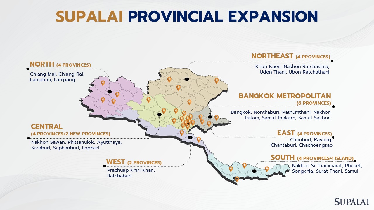 “เราเป็นบริษัทที่พัฒนาโครงการในภูมิภาคมากที่สุด โดยมีโครงการใน 31 จังหวัดทั่วประเทศ โดยการกระจายตัวนี้ ไม่เพียงช่วยลดความเสี่ยง แต่ยังเป็นการเพิ่มศักยภาพการเติบโตของบริษัทฯ ด้วย ซึ่งในบางจังหวัดที่อาจยังไม่มีคู่แข่งรายใหญ่เข้าไป แต่เรา (ศุภาลัย) สามารถเข้าไปตอบสนองความต้องการของผู้ที่มีกำลังซื้อได้ อาทิ จังหวัดนครสวรรค์ ศุภาลัยสามารถขายโครงการได้หลายร้อยล้านบาทในเดือนแรก ซึ่งสะท้อนให้เห็นว่า การบุกเบิกในหัวเมืองต่างจังหวัดเป็นโอกาสสำคัญที่ช่วยให้บริษัทเติบโต”