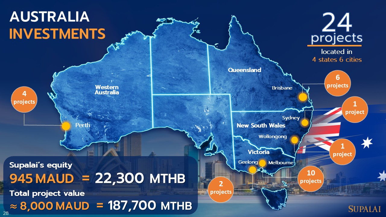ที่น่าสนใจกว่านั้น คือ การขยายกิจการออกไปต่างประเทศของศุภาลัย ในฐานะหนึ่งในบริษัทพัฒนาอสังหาริมทรัพย์ชั้นนำของไทย ได้แสดงให้เห็นถึงการขยับตัวเชิงกลยุทธ์ครั้งสำคัญ เมื่อเลือกขยายธุรกิจไปยังต่างประเทศ โดยเฉพาะตลาดออสเตรเลีย ซึ่งมีโครงการที่กำลังพัฒนาอยู่ถึง 24 โครงการใน 6 เมือง