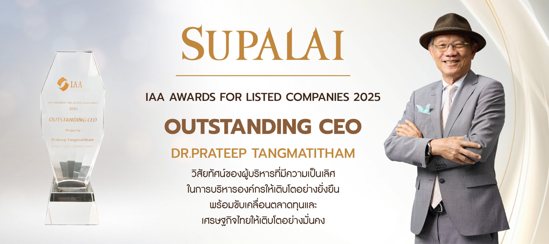 บริษัท ศุภาลัย จำกัด (มหาชน) ผู้นำธุรกิจพัฒนาอสังหาริมทรัพย์ คว้ารางวัลคุณภาพ “Outstanding CEO” ในกลุ่มพัฒนาอสังหาริมทรัพย์ จากเวที IAA Awards for Listed Companies 2025 มอบให้แก่ ดร.ประทีป ตั้งมติธรรม ประธานกรรมการบริหาร รางวัลดังกล่าวมอบให้ผู้บริหารที่มีความเป็นเลิศด้านการบริหารธุรกิจ สะท้อนวิสัยทัศน์และบทบาทสำคัญในการขับเคลื่อนองค์กรให้ประสบความสำเร็จเติบโตอย่างยั่งยืน ตลอดจนมีส่วนร่วมในการพัฒนาเศรษฐกิจและตลาดทุนของประเทศไทยโดยรวม