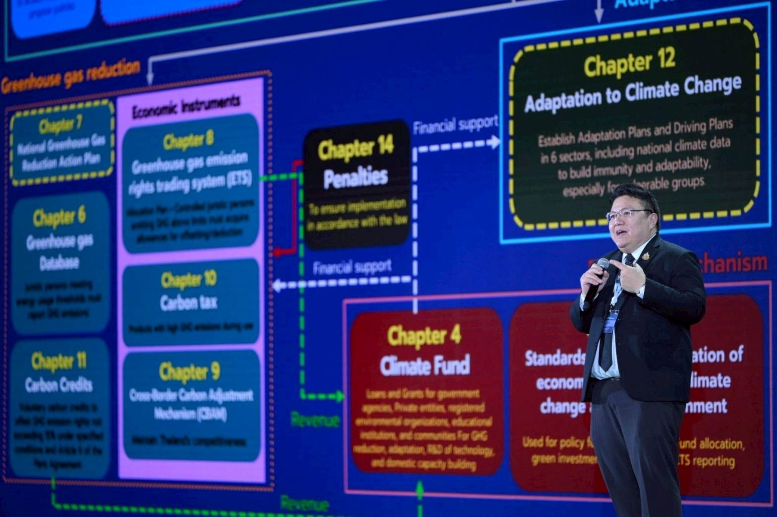 ดร.กิตติศักดิ์ พฤกษ์กานนท์ ผู้แทนกรมการเปลี่ยนแปลงสภาพภูมิอากาศและสิ่งแวดล้อม กล่าวว่า “สถานการณ์ปัจจุบันและแนวโน้มการดำเนินงานระดับโลก ยุทธศาสตร์และทิศทางนโยบายสำคัญของประเทศไทยที่จะเป็นการแก้ไขปัญหาเร่งด่วน ผลักดันการดำเนินงานเพื่อการพัฒนาที่ยั่งยืน การรับมือกับการเปลี่ยนแปลงสภาพภูมิอากาศ (Climate Action) การผลักดันการดำเนินงานเพื่อรองรับการเปลี่ยนแปลงสภาพภูมิอากาศ ทั้งในด้านการลดก๊าซเรือนกระจก (Mitigation) และการปรับตัวต่อการเปลี่ยนแปลงสภาพภูมิอากาศ (Adaptation) รวมทั้งการพัฒนาและดำเนินมาตรการ กลไก/เครื่องมือที่จำเป็น เพื่อขับเคลื่อนการดำเนินงานจากนโยบายไปสู่การปฏิบัติอย่างเป็นรูปธรรม เช่น การตรา พระราชบัญญัติการเปลี่ยนแปลงสภาพภูมิอากาศ พ.ศ. … และกฎหมายลำดับรอง การจัดตั้งกองทุนภูมิอากาศ (Climate Fund) เพื่อให้การดำเนินงานสามารถสะท้อนเทคโนโลยีใหม่และสถานการณ์เศรษฐกิจ-สังคมที่เปลี่ยนไปอย่างต่อเนื่อง ปัจจุบันกรมฯ อยู่ระหว่างปรับปรุงแผนแม่บทรองรับการเปลี่ยนแปลงสภาพภูมิอากาศ การจัดทำแผนระยะสั้นที่สอดคล้องกับยุทธศาสตร์ระยะยาวในการพัฒนาแบบปล่อยก๊าซเรือนกระจกต่ำของประเทศ (Thailand’s Long-Term Low Greenhouse Gas Emission Development Strategy : LT-LEDS) การพัฒนาระบบติดตามและประเมินผล การส่งเสริมองค์ความรู้ การวิจัย นวัตกรรม และการพัฒนาขีดความสามารถ ตลอดจนการสื่อสารและสร้างการมีส่วนร่วมกับทุกภาคส่วน และมีแผนจะดำเนินโครงการศึกษาแนวทางการเปลี่ยนผ่านอย่างเป็นธรรม (Just Transition) สำหรับ