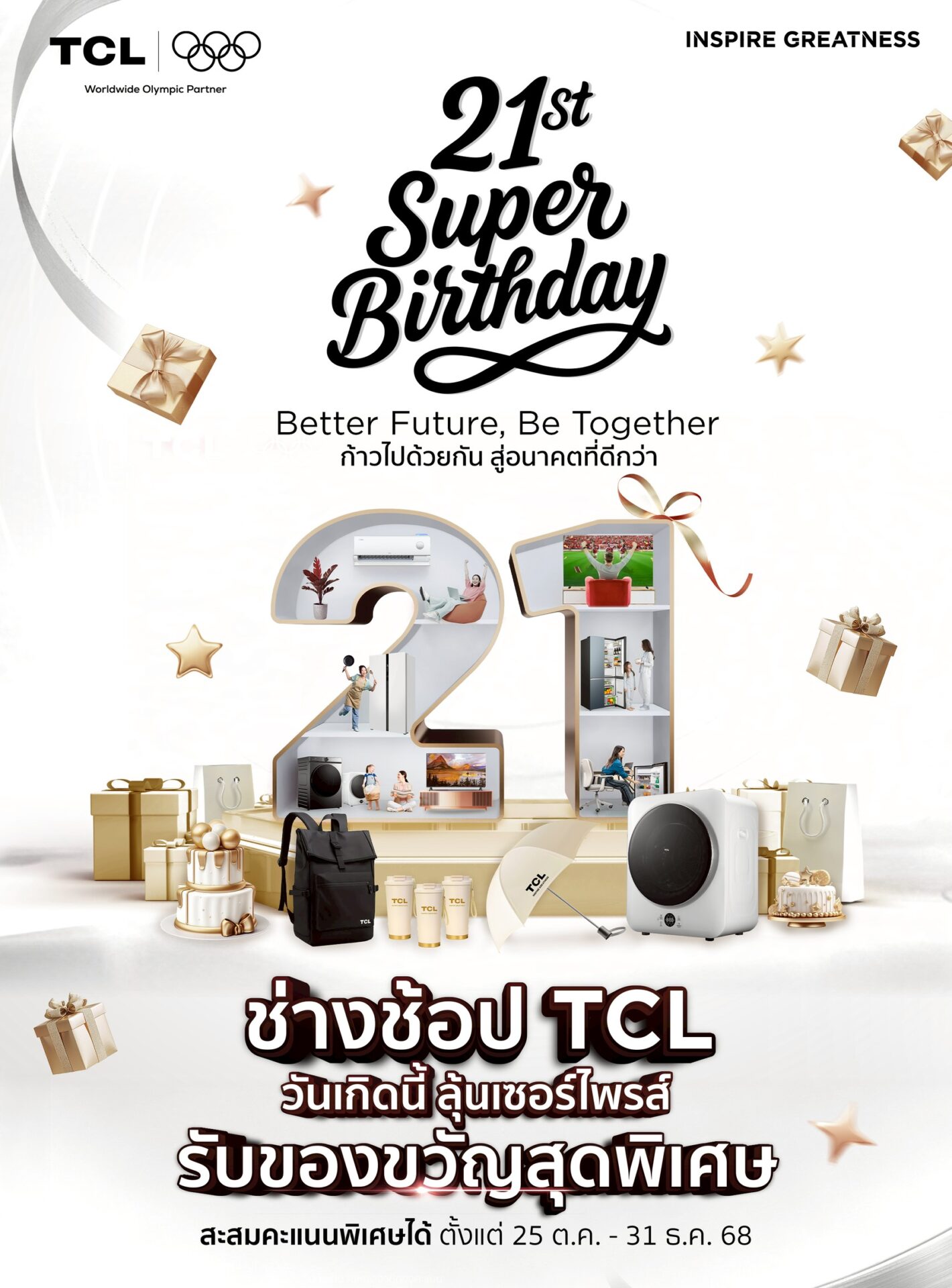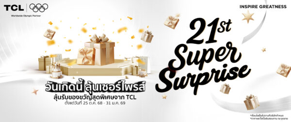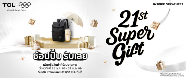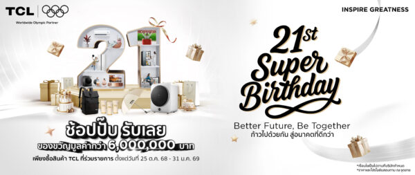 TCL จัดงานฉลองครบรอบ 21 ปี สุดปัง เปิดแคมเปญ 21st Super Birthday | Better Future, Be Together  ก้าวไปด้วยกัน สู่อนาคตที่ดีกว่า คืนกำไรลูกค้าครั้งใหญ่ แจกของขวัญมูลค่ารวมกว่า 6,000,000 บาท ช้อปปั๊บ รับเลย  เริ่มตั้งแต่วันที่ 25 ต.ค. 68 – 31 ม.ค. 69  พิเศษ  ซื้อ Mini LED TV  รับฟรีเครื่องอบผ้า Mini Dryer มูลค่า 5,990 บาททันที พร้อมกิจกรรม   Super Star Content  สุดยอด Content Creator ตัวจริงชิงรางวัลรวม 42 รางวัล  มูลค่ารวมกว่า 480,000 บาท ตั้งแต่วันที่                       1 พ.ย. 2568 – 5 ม.ค. 2569  พร้อมเปิดตัว “Super Start Up” เฟ้นหา 21 ผู้ประกอบการรุ่นใหม่ ร่วมสร้างอนาคตที่ดีกว่า