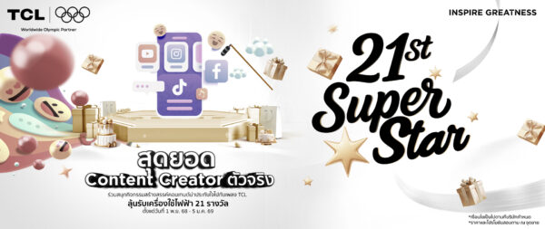 TCL ขอเชิญชวนผู้บริโภค ช่างแอร์ และลูกค้าทั่วไป ร่วมเฉลิมฉลองครบรอบ 21 ปี ด้วยการสร้างสรรค์คอนเทนต์สุดประทับใจประกอบเพลง TCL ในกิจกรรม Super Star Content สุดยอด Content Creator ตัวจริง” เริ่มตั้งแต่วันที่ 1 พ.ย. 68 – 5 ม.ค. 69  ลุ้นรับเครื่องใช้ไฟฟ้า   พรีเมียมรวม 42 รางวัล ในแต่ละประเภท มูลค่ารวมกว่า 538,580 บาท