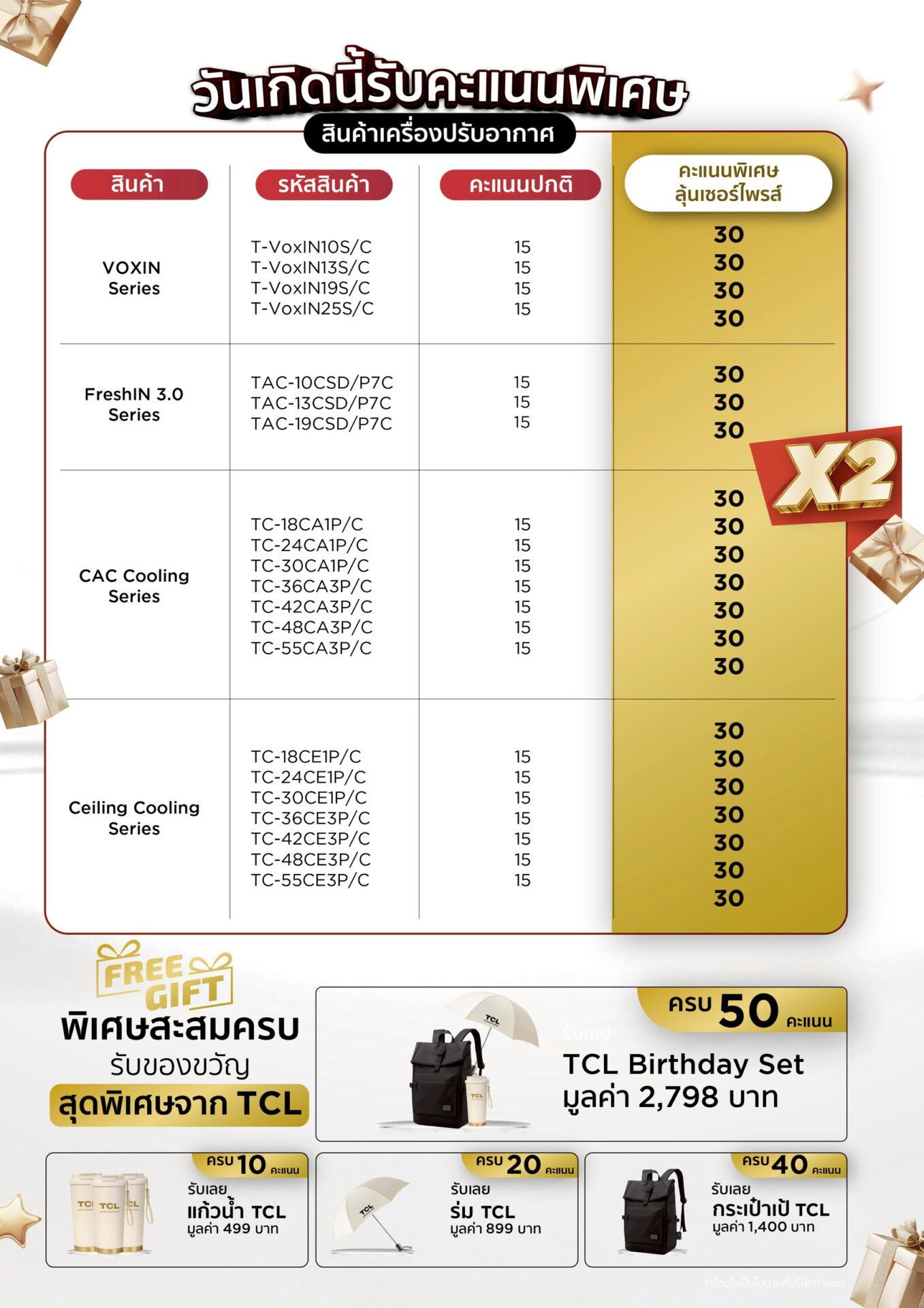 พิเศษสำหรับกลุ่มช่างติดตั้งเครื่องปรับอากาศ  กับกิจกรรม “ช่างช้อป TCL  วันเกิดนี้ ลุ้นเซอร์ไพรส์” เพียงซื้อเครื่องปรับอากาศ TCL รุ่นที่ร่วมรายการ รับคะแนนพิเศษ X2 (สองเท่า) เพื่อสะสมและแลกรับของขวัญสุดพิเศษจาก TCL ตั้งแต่วันที่ 25 ต.ค. 68 – 31 ธ.ค. 68