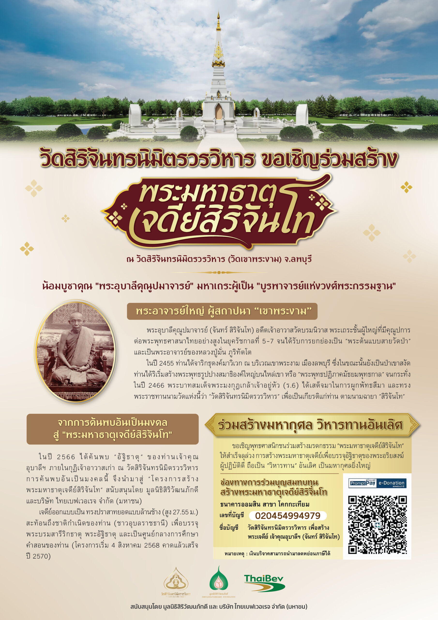 ขอเชิญพุทธศาสนิกชนร่วมสร้างมรดกธรรม “พระมหาธาตุเจดีย์สิริจันโท” ให้สำเร็จลุล่วง การสร้างพระมหาธาตุเจดีย์เพื่อบรรจุอัฐิธาตุของพระอริยสงฆ์ผู้ปฏิบัติดี ถือเป็น “วิหารทาน” อันเลิศ เป็นมหากุศลยิ่งใหญ่