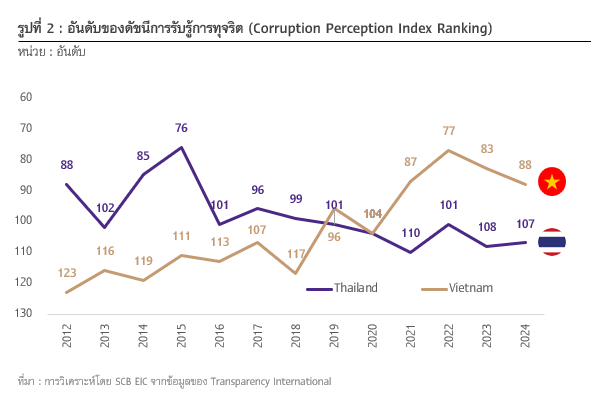 ขณะที่ไทยกำลังเผชิญความท้าทายด้านประสิทธิภาพภาครัฐ ประเทศคู่แข่งอย่างเวียดนามกลับพัฒนาขึ้นเร็วและมีแผนพัฒนาประเทศจากนโยบายปฏิรูปครั้งใหญ่ แม้เวียดนามจะไม่ได้ถูกจัดอันดับใน IMD แต่หากพิจารณาผ่านดัชนี Worldwide Governance Indicators ของธนาคารโลก ในหมวดประสิทธิภาพภาครัฐ ซึ่งสำรวจคุณภาพของบริการสาธารณะและระบบราชการ รวมถึงการปฏิบัติตามแนวนโยบายที่ให้ไว้กับประชาชน ในช่วงปี 2014-2023 พบว่า เวียดนามมีอันดับ Percentile เพิ่มขึ้นเป็น 56.1 จาก 53.8 (โดยค่า Percentile สูง หมายถึง ประสิทธิภาพภาครัฐดีขึ้น) ขณะที่อันดับไทยปรับลดลงอยู่ที่ 58.5 จาก 63 ด้านการทุจริต ซึ่งวัดจากดัชนีรับรู้การทุจริตหรือ Corruption Perception Index ของเวียดนามแซงไทยได้แล้ว โดยอันดับของไทยปรับลดลงสู่อันดับ 107 ในปี 2024 จากเดิมอันดับ 76 ในปี 2015 สวนทางกับเวียดนาม ซึ่งอันดับปรับดีขึ้นเป็น 88 จากเดิมอันดับ 111 ในปี 2015 สะท้อนความสำเร็จของเวียดนามจากความพยายามปราบการทุจริตครั้งใหญ่ตั้งแต่ปี 2016 และยังดำเนินการต่อเนื่องถึงปัจจุบัน (รูปที่ 2)