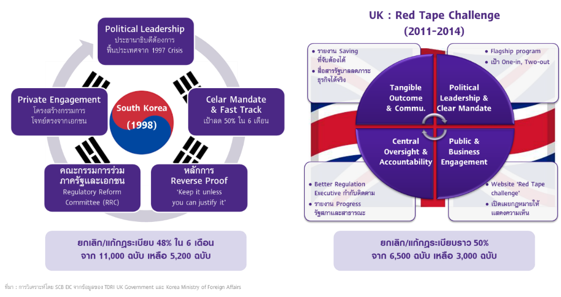 ประเทศที่ปฏิรูปกฎเกณฑ์ภาครัฐได้สำเร็จ เช่น เกาหลีใต้ สหราชอาณาจักร และเวียดนาม ต่างมีปัจจัยร่วม คือ ผู้นำตั้งเป้าหมายปฏิรูปครั้งใหญ่และกำหนดกรอบเวลาชัดเจน การตั้งเจ้าภาพกลางที่มีอำนาจกำกับติดตาม การออกแบบระบบติดตามความคืบหน้าที่โปร่งใส รวมถึงการเปิดให้ภาคเอกชนและภาคประชาสังคมมีส่วนร่วมให้ข้อมูลเพื่อปรับปรุง
