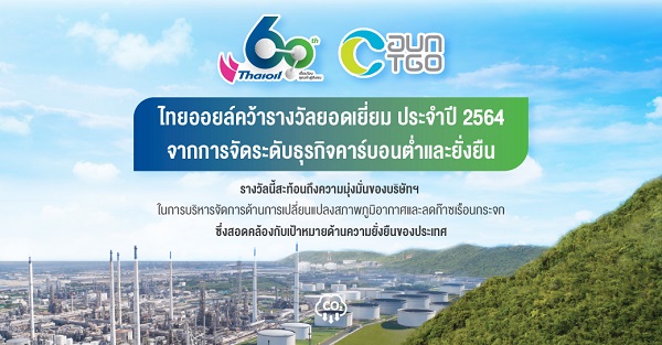 เมื่อเร็วๆนี้ บริษัท ไทยออยล์ จำกัด (มหาชน) โดย คุณนิคม ฆ้องนอก ผู้จัดการฝ่ายกิจการองค์กรและความยั่งยืน รับมอบรางวัล “ยอดเยี่ยม” จากการจัดระดับธุรกิจคาร์บอนต่ำและยั่งยืน ประจำปี 2564 จาก คุณเกียรติชาย ไมตรีวงษ์ ผู้อำนวยการองค์การบริหารจัดการก๊าซเรือนกระจก ผ่านการสัมมนาออนไลน์ “แนวทางการดำเนินธุรกิจยุคใหม่ที่คาร์บอนต่ำและยั่งยืน และประกาศผลการประเมินและจัดระดับธุรกิจคาร์บอนต่ำและยั่งยืน ประจำปี 2564” จัดโดยองค์การบริหารจัดการก๊าซเรือนกระจก (องค์กรมหาชน)