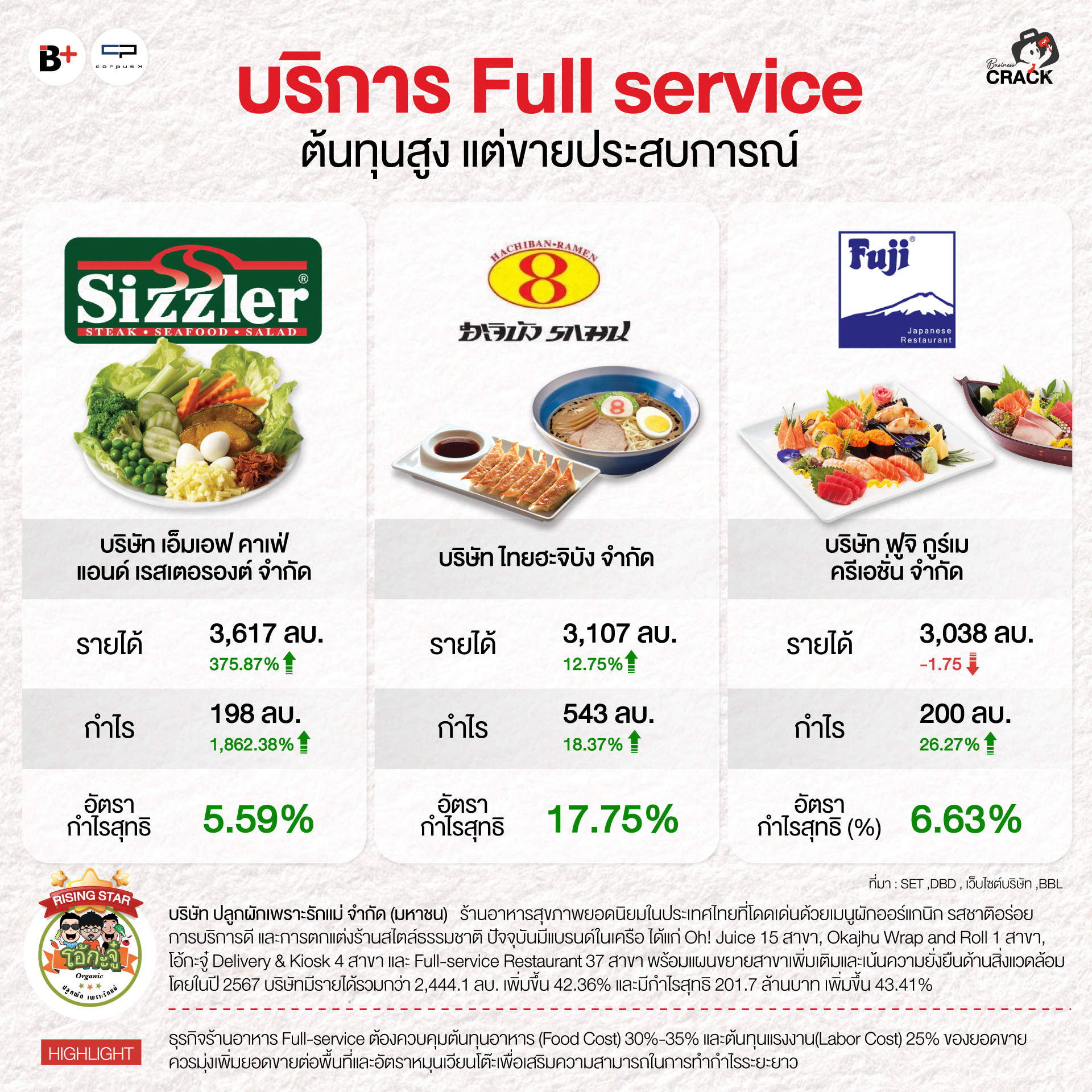 ที่โดดเด่นที่สุดคือ ซูชิโร่ จีเอช (ประเทศไทย) ทะยานขึ้นเป็น Rising Star ของกลุ่ม Limited-service ด้วยรายได้และกำไรที่โตแบบก้าวกระโดด จุดแข็งคือการผสมผสานคุณภาพ ความรวดเร็ว และระบบบริการที่ล้ำสมัย ตอบโจทย์คนเมืองที่ต้องการ “เร็ว + คุ้ม + มีคุณภาพ”