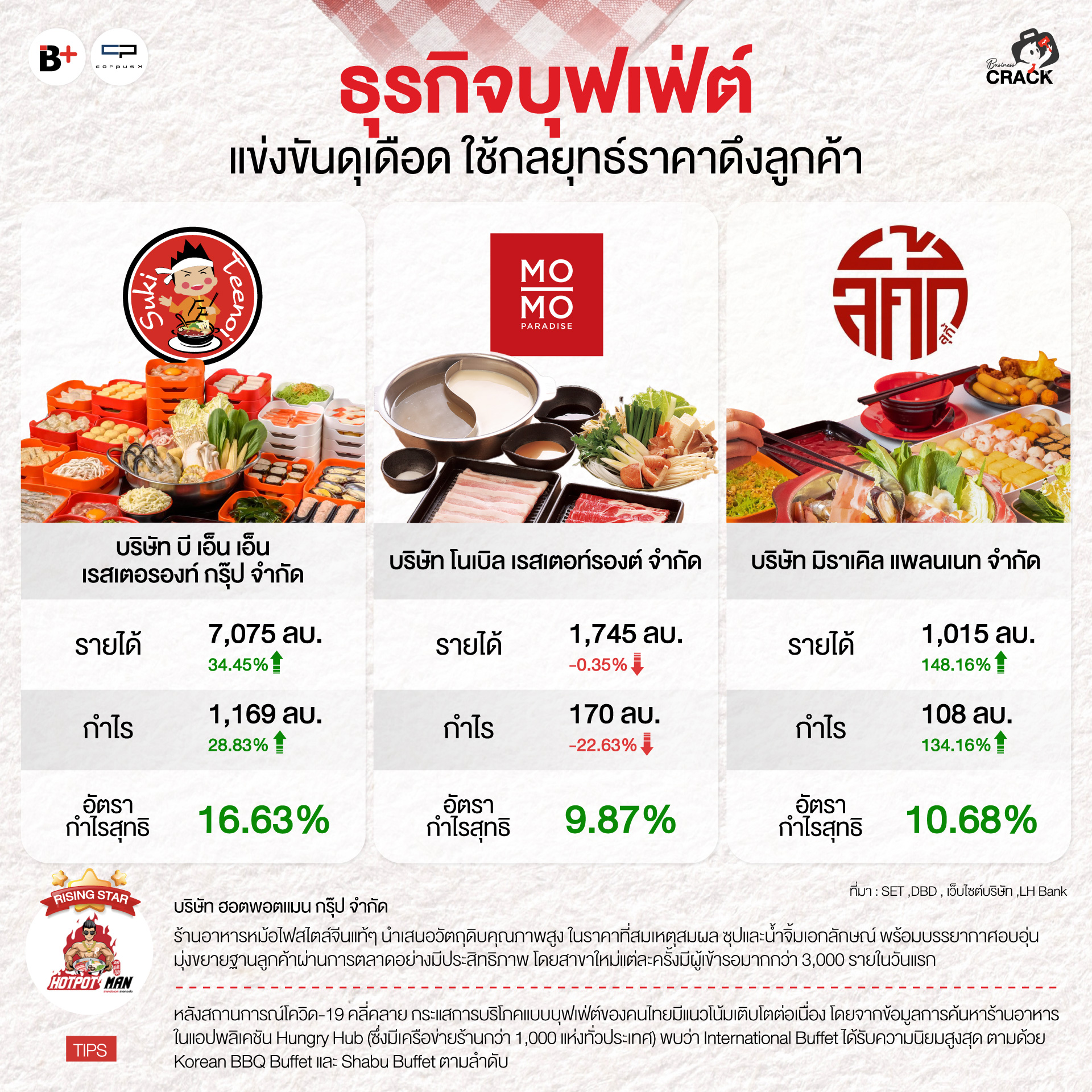 แม้บางรายอย่าง โนเบิล เรสเตอรองต์ และ มิราเคิล แพลนเนท มีรายได้ต่างกันมาก แต่ก็ยังยืนหยัดในตลาดได้ ซึ่งสะท้อนว่าบุฟเฟ่ต์ยังคงมีฐานลูกค้ากว้าง