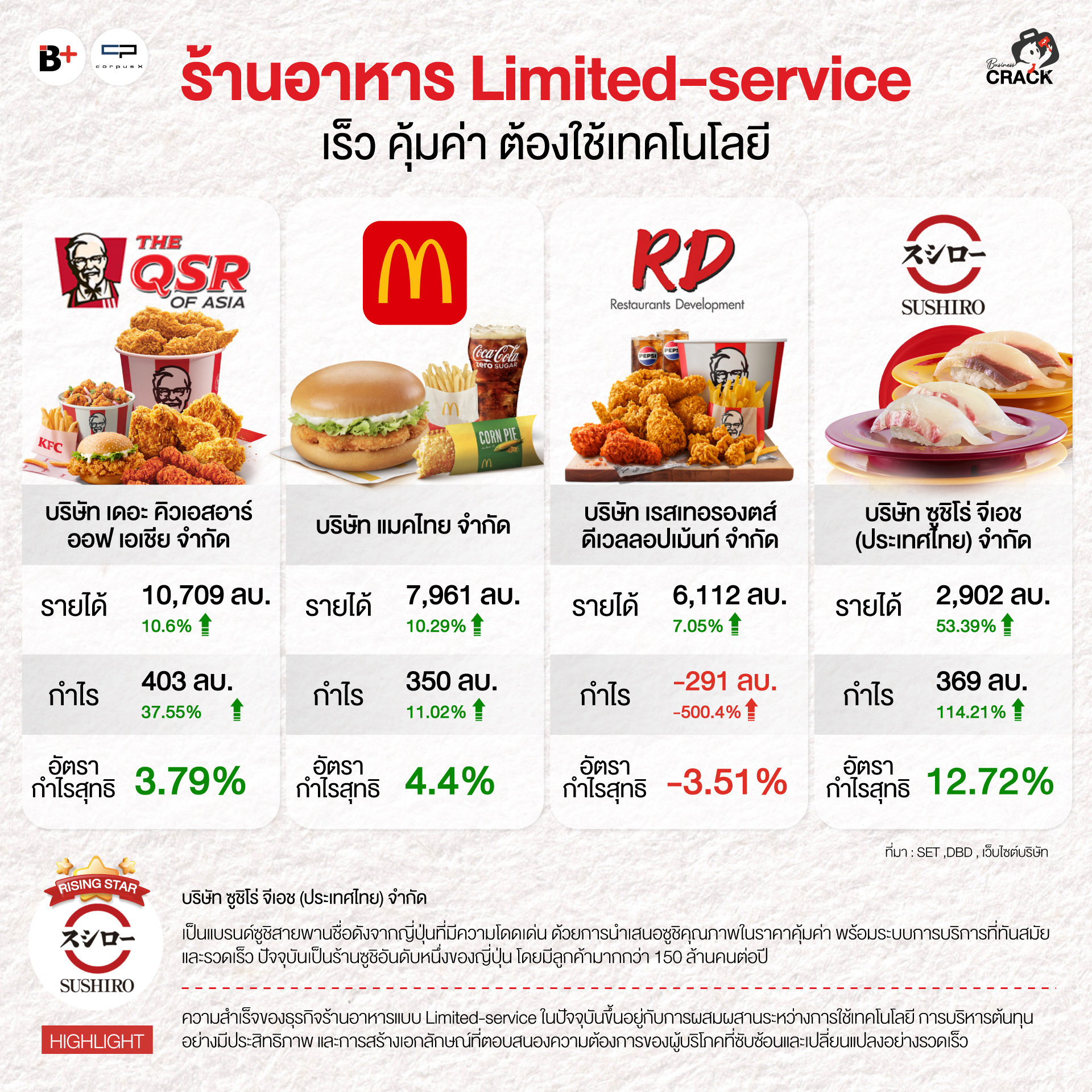 ธุรกิจ Limited-service เน้นความรวดเร็ว ราคาจับต้องได้ และใช้เทคโนโลยีเพื่อบริหารต้นทุน โดยมี เดอะ คิวเอสอาร์ ออฟ เอเชีย ครองตลาดด้วยรายได้ 10,700 ล้านบาท และกำไร 402 ล้านบาท ตามมาด้วย แมคไทย (McDonald’s) ที่สร้างรายได้กว่า 7,960 ล้านบาท และกำไร 350 ล้านบาท ส่วน เรสเทอรองตส์ ดีเวลลอปเม้นท์ เจ้าของ Burger King และ Dairy Queen ยังเผชิญภาวะขาดทุนกว่า 291 ล้านบาท