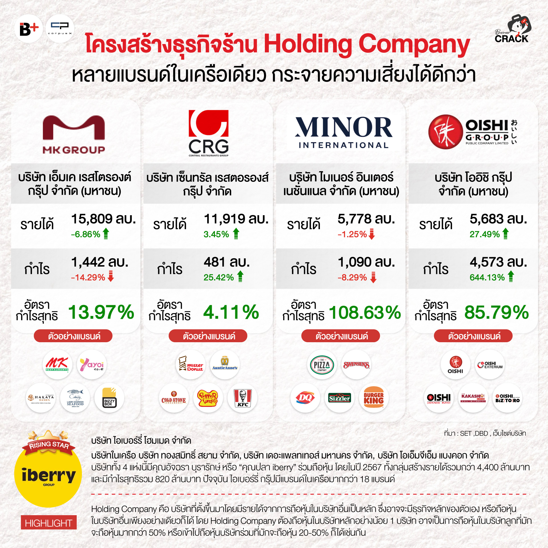 สุดท้ายคือกลุ่ม Holding Company ที่ถือพอร์ตแบรนด์มหาศาลและสามารถบริหารความเสี่ยงได้ดีกว่าใคร โดย เอ็มเค เรสโตรองต์ กรุ๊ป (มหาชน) นำโด่งด้วยรายได้ 13,778 ล้านบาท และกำไรสุทธิ 1,441 ล้านบาท จากแบรนด์ดังอย่าง MK สุกี้ และยาโยอิ ส่วน เซ็นทรัล เรสตอรองส์ กรุ๊ป (CRG) ติดอันดับสองด้วยรายได้ 11,919 ล้านบาท พร้อมแบรนด์แมสทั้ง KFC, Mister Donut และ Shinkanzen Sushi