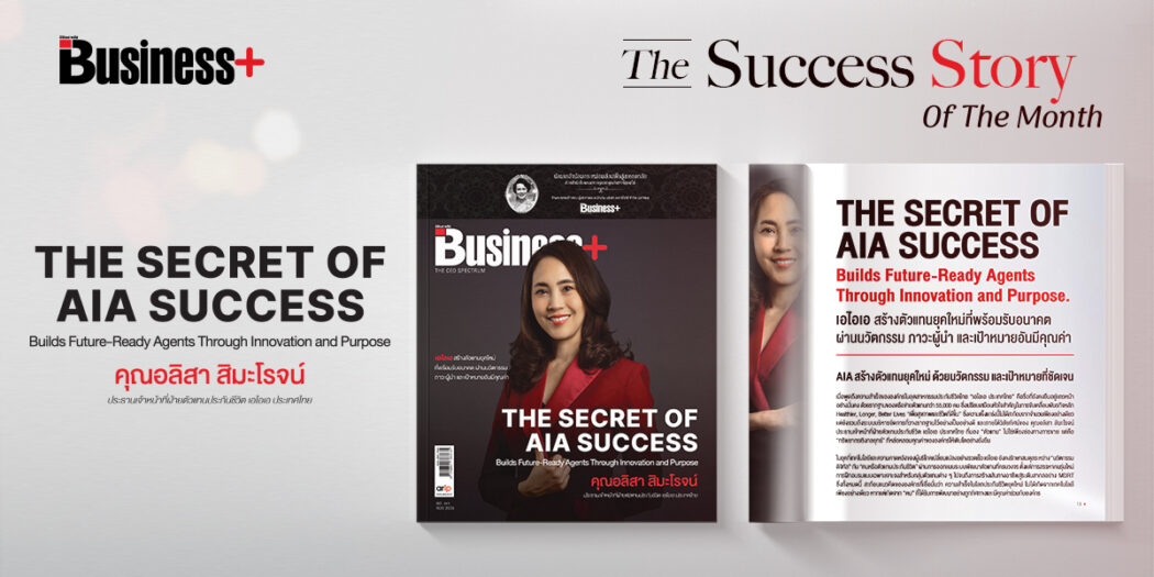 The Success Story of The Month By ‘Business Plus’ ฉบับเดือนพฤศจิกายน 2568 จะพาผู้อ่านมาพบกับบทสัมภาษณ์สุดพิเศษจาก คุณอลิสา สิมะโรจน์ ประธานเจ้าหน้าที่ฝ่ายตัวแทนประกันชีวิต เอไอเอ ประเทศไทย ถึงเรื่องราวและเบื้องหลังของการสร้างตัวแทนยุคใหม่ ด้วยนวัตกรรม และเป้าหมายที่ชัดเจน ภายใต้วิสัยทัศน์ที่มองว่า “ตัวแทน” ไม่ใช่เพียงช่องทางการขาย แต่คือ “ทรัพยากรเชิงกลยุทธ์” ที่หล่อหลอมคุณค่าขององค์กรให้เติบโตอย่างยั่งยืน