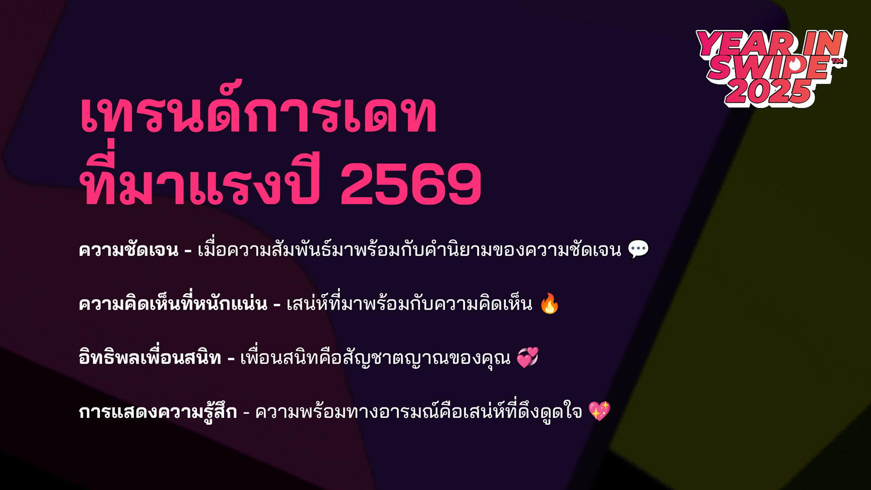 คนโสดที่กำลังมองหาคนรู้ใจในปี 2569 จะต้องบาลานซ์ระหว่างการพูดคุยและความรู้สึก โดยแสดงให้เห็นว่าต้องการเคมีที่มีความหมายแต่ไม่ซับซ้อนเกินไป 56% ให้ความสำคัญกับบทสนทนาที่จริงใจมากที่สุด 45% ต้องการความเห็นอกเห็นใจมากขึ้นหลังจากโดนปฏิเสธ และคำที่ใช้นิยามการเดทปี 256911 มากที่สุดคือ “มีความหวัง” เรียกได้ว่า ความหวังเป็นสิ่งที่กำลังมาแรง และคนโสดก็ไม่กลัวที่จะแสดงออกมา!