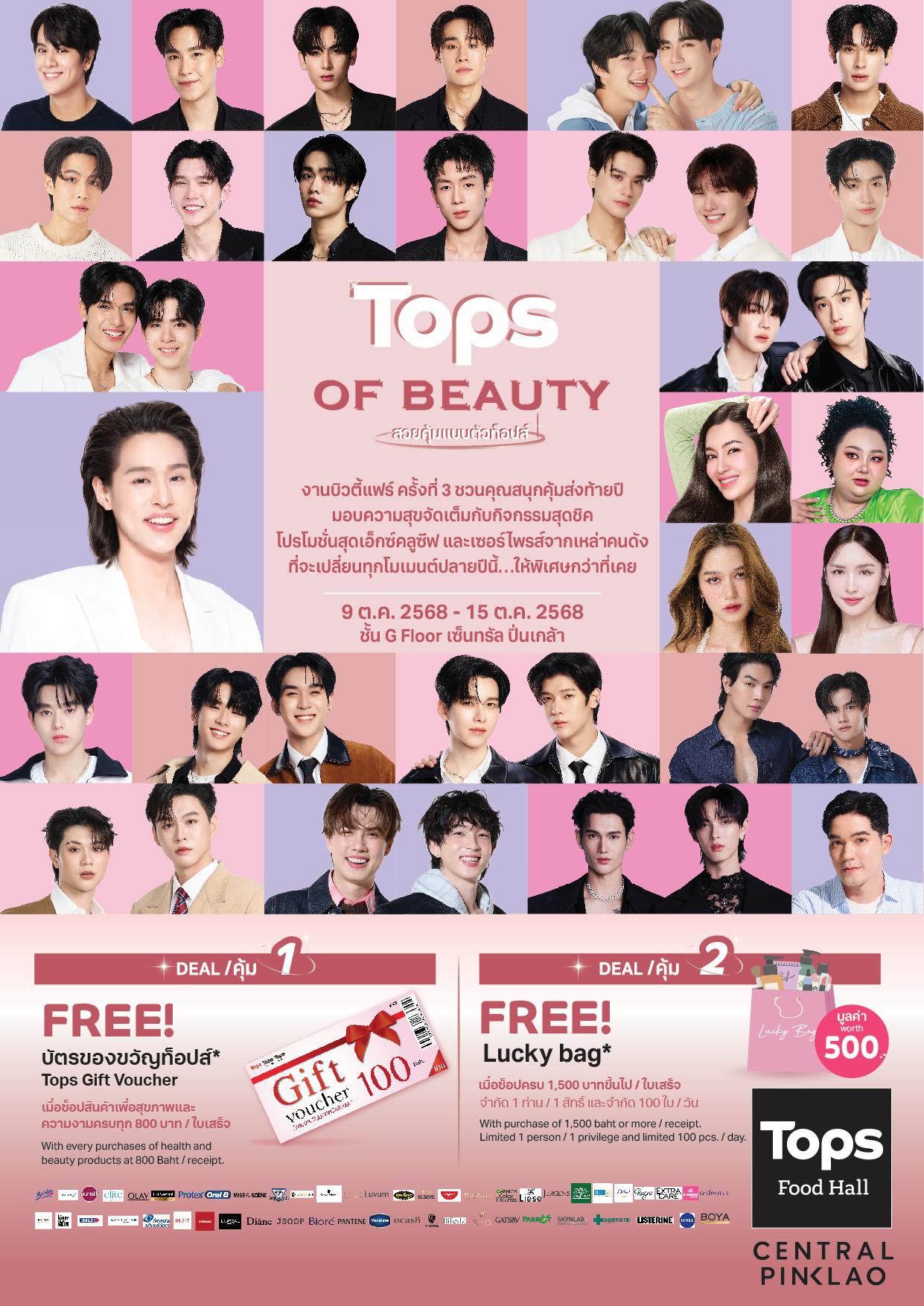 ท็อปส์ ธุรกิจกลุ่มฟู้ด ในเครือเซ็นทรัล รีเทล จัดงาน ‘TOPS of Beauty’ ชวนขาช้อปและสายบิวตี้มาช้อปสุดคุ้มกับหลากหลายสินค้าบิวตี้ไอเทมแบรนด์ดัง พร้อมเสิร์ฟความฟินกับกิจกรรมสุดเอ็กซ์คลูซีฟจากเหล่าศิลปิน ดารา และบิวตี้อินฟลูเอนเซอร์ชื่อดังแบบใกล้ชิด นำโดยซูเปอร์สตาร์สุดฮอตอย่าง บิวกิ้น พุฒิพงศ์, นางเอกขวัญใจมหาชน เบลล่า ราณี, นักร้องสาวเสียงดี วีโอเลต วอเทียร์ และยังมีทัพนักแสดงอีกมากมายที่จะแวะเวียนมาสร้างสีสัน อาทิ โทมัส ธีร์ทัศน์ , เฟิร์ส คณพันธ์, นนน กรภัทร์, เติ้ล มติมันท์ & เฟิร์สวัน วรรณกร , นิว ชยภัค , แซนต้า พงศภัค , ซี พฤกษ์ – นุนิว ชวรินทร์ , จูเนียร์ ปณชัย , เก่ง หฤษฎ์ – น้ำปิง นภัสกร ฯลฯ โดยภายในงานยกขบวนไอเทมสินค้าบิวตี้จากแบรนด์ชั้นนำและแบรนด์พันธมิตรมาให้ช้อปทั้ง สกินแคร์ เมกอัพ บอดี้แคร์ ผลิตภัณฑ์ดูแลเส้นผม,ผลิตภัณฑ์ดูแลช่องปาก และบิวตี้แกดเจ็ต อาทิ Puricas, Mondahmin, A BONNE’, MISE en SCÈNE, RYO, SYSTEMA, SALZ, SKYNLAB, ardermis, Dove, Biore, Liese, JERGENS, BOYA, NIVEA, TSUBAKI, Fino, De Leaf, Schwarzkopf, GARNIER, Head & Shoulders, PANTENE, OLAY, Colgate, Bifesta, BeNice และอีกมากมายมาให้แบบเลือกช้อป พร้อมมอบโปรโมชันสุดคุ้ม คุ้มที่ 1 รับบัตรของขวัญท็อปส์ มูลค่า 100 บาท เมื่อซื้อสินค้าสุขภาพและความงามที่ร่วมรายการครบทุก 800 บาทขึ้นไป/ ใบเสร็จ คุ้มที่ 2 รับกระเป๋า Lucky Bag มูลค่า 500 บาท เมื่อซื้อสินค้าคุณภาพในงานครบ 1,500 บาท /ใบเสร็จ (จำกัด 1 ท่าน / 1 สิทธิ์ และจำกัด 100 ใบ/วัน) ตั้งแต่วันที่ 9 – 15 ตุลาคม 2568 ที่ ชั้น G ศูนย์การค้าเซ็นทรัล ปิ่นเกล้า หรือช้อปสะดวกทุกที่ผ่าน TOPS Online ติดตามข้อมูลและรายละเอียดเพิ่มเติมได้ที่ www.tops.co.th, เฟซบุ๊ก TOPSThailand และไลน์ @TOPSThailand.