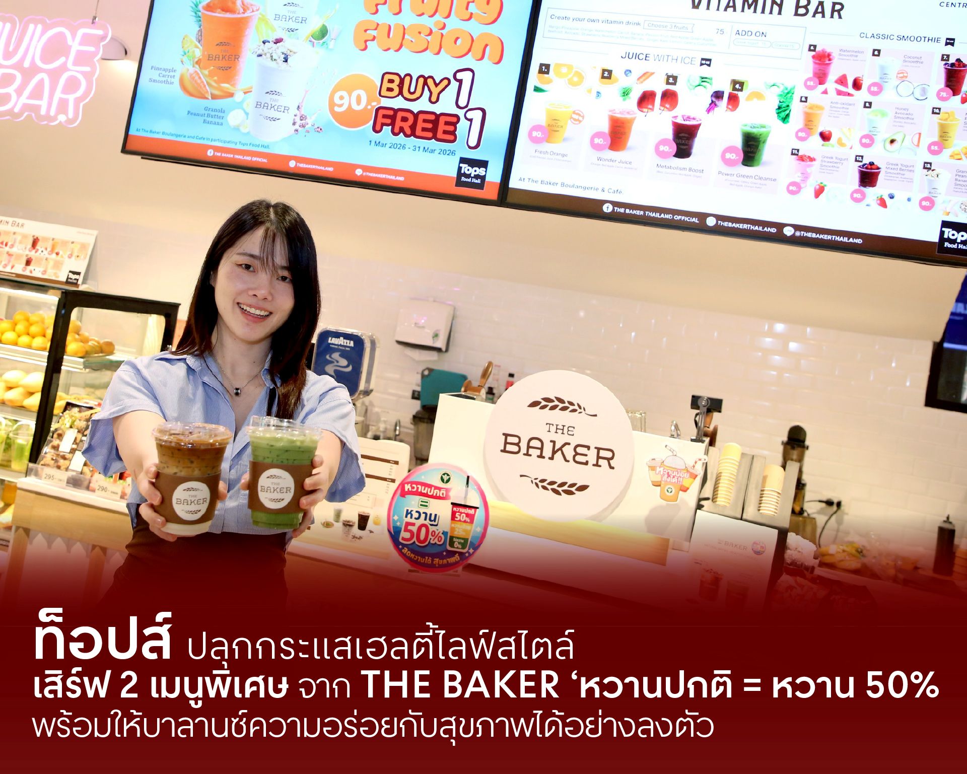 ท่ามกลางกระแสการดูแลสุขภาพที่เพิ่มขึ้นอย่างต่อเนื่องในสังคมไทย โดยเฉพาะปัญหาภาวะน้ำหนักเกินและโรคอ้วนที่กำลังกลายเป็นความท้าทายด้านสาธารณสุขสำคัญ จากผลการสำรวจสุขภาพประชาชนไทยโดยการตรวจร่างกาย ครั้งที่ 7 (National Health Examination Survey: NHES) ระหว่างปี 2567–2568 ซึ่งดำเนินการโดยคณะแพทยศาสตร์โรงพยาบาลรามาธิบดี ร่วมกับสถาบันวิจัยระบบสาธารณสุข (สวรส.) และสำนักงานกองทุนสนับสนุนการสร้างเสริมสุขภาพ (สสส.) พบว่า คนไทยอายุ 15 ปีขึ้นไป มีภาวะน้ำหนักเกินกว่า 45% หรือเกือบครึ่งหนึ่งของประชากรทั้งหมด โดยโรคอ้วนถือเป็นหนึ่งในปัจจัยเสี่ยงสำคัญของโรคไม่ติดต่อเรื้อรัง (NCDs) อาทิ โรคเบาหวาน และโรคหัวใจและหลอดเลือด ซึ่งเป็นสาเหตุการเสียชีวิตอันดับต้น ๆ ของคนไทย สะท้อนถึงความจำเป็นในการปรับพฤติกรรมการบริโภค โดยเฉพาะการลดน้ำตาลในอาหารและเครื่องดื่มในชีวิตประจำวัน ทั้งนี้ ท็อปส์ในฐานะผู้นำธุรกิจฟู้ดรีเทล ได้ตระหนักถึงบทบาทในการสนับสนุนทางเลือกการบริโภคที่ดีต่อสุขภาพ จึงเข้าร่วมโครงการกับกรมอนามัย ขับเคลื่อนมาตรฐาน “หวานปกติ = หวาน 50%” พร้อมพัฒนาคอลเลกชันเมนูเครื่องดื่มพิเศษภายใต้แบรนด์ THE BAKER เพื่อตอบโจทย์ผู้บริโภคยุคใหม่ที่ต้องการบาลานซ์ความอร่อยควบคู่กับการดูแลสุขภาพ พร้อมเปิดตัว 2 เมนูพิเศษที่ให้ความหวานครึ่งเดียว แต่ยังคงรสชาติอร่อยเต็มแก้ว ได้แก่