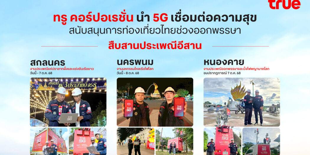 ทรู คอร์ปอเรชั่นเตรียมความพร้อมด้านเครือข่าย 5G และ 4G รองรับนักท่องเที่ยวทั้งไทยและต่างชาติที่เดินทางเข้าสู่ภาคอีสานในช่วงเทศกาลประเพณีสำคัญ 3 งานใหญ่ ได้แก่ งานประเพณีแห่ปราสาทผึ้งและแข่งขันเรือยาว จังหวัดสกลนคร, งานมหกรรมไหลเรือไฟโลก จังหวัดนครพนม และงานประเพณีออกพรรษาและบั้งไฟพญานาคโลก จังหวัดหนองคาย โดยจัดเต็มโซลูชันทั้งเพิ่มรถโมบายล์สถานีฐานเคลื่อนที่เร็ว หรือ COW, เสาสัญญาณชั่วคราว, การปรับแต่งสัญญาณตามพฤติกรรมการใช้งาน, จัดทีมวิศวกรประจำพื้นที่งาน, เสริมสัญญาณบนเส้นทางคมนาคมและแหล่งท่องเที่ยว พร้อมศูนย์ปฏิบัติการเครือข่ายอัจฉริยะ (BNIC) ที่นำ AI ดูแลตลอด 24 ชั่วโมง เพื่อให้นักท่องเที่ยวได้สัมผัสประสบการณ์การเชื่อมต่อดิจิทัลต่อเนื่องและมีประสิทธิภาพตลอดการเข้าร่วมงานประเพณีอันทรงคุณค่าของชาวอีสาน พร้อมบูธกิจกรรมพิเศษภายในงานที่จังหวัดนครพนมและหนองคายเพื่อรองรับนักท่องเที่ยว รวมทั้งลูกค้าทรูและดีแทค ด้วยความสนุกและข้อเสนอพิเศษอีกด้วย